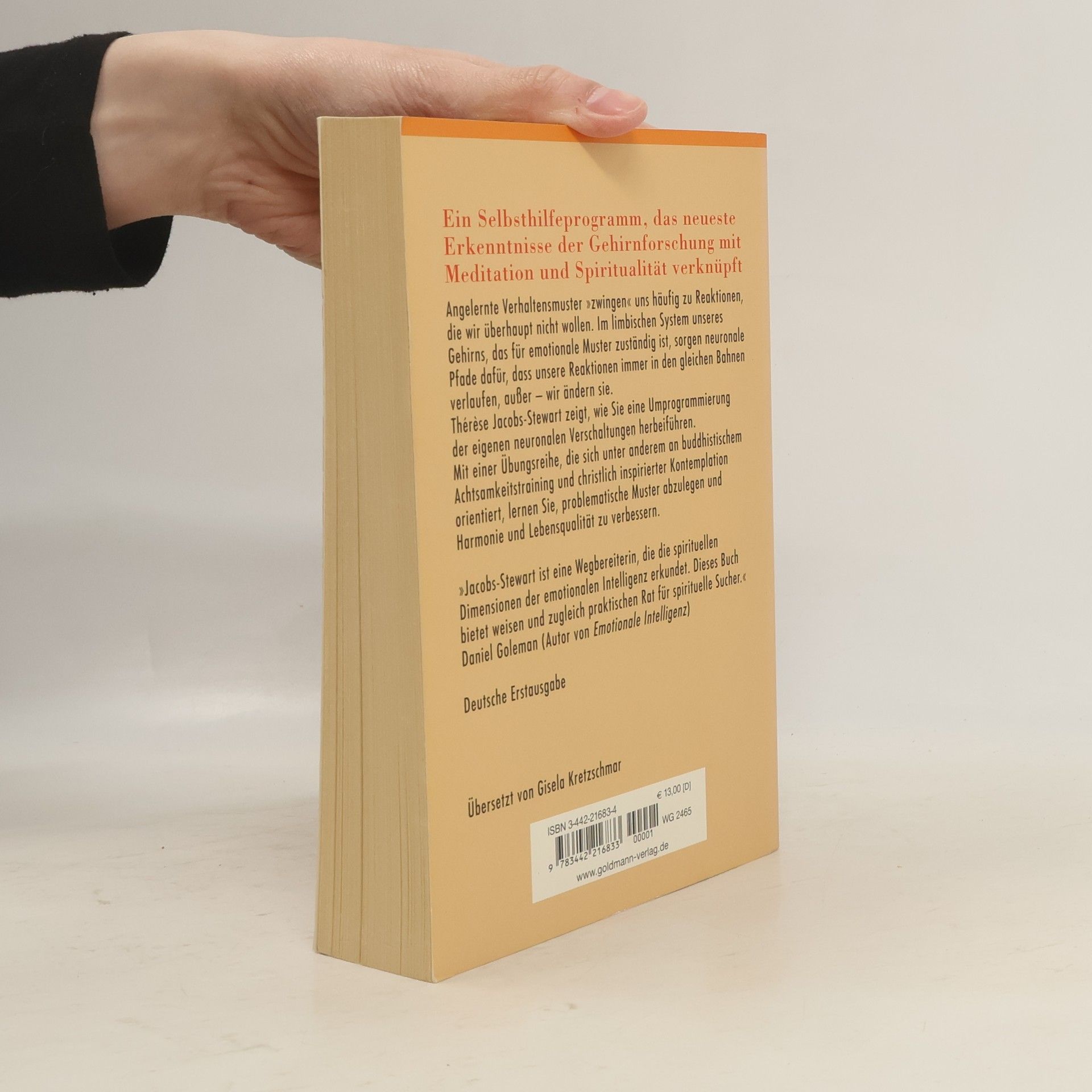 Agieren statt Reagieren – das wär’s doch! Leider zwingen uns angelernte Verhaltensmuster häufig zu Reaktionen, die wir überhaupt nicht wollen. Neuronale Pfade in unserem Gehirn sorgen dafür, dass unsere Reaktionen immer in den gleichen Bahnen verlaufen. Thérèse Jacobs-Stewart kombiniert Methoden aus Psychologie und Meditation, um uns mehr Lebensqualität zu ermöglichen. Mit Hilfe ihrer geistigen Übungen lässt sich eine Umprogrammierung herbeiführen, die dabei hilft, emotionale Muster abzubauen und kreativer zu leben.