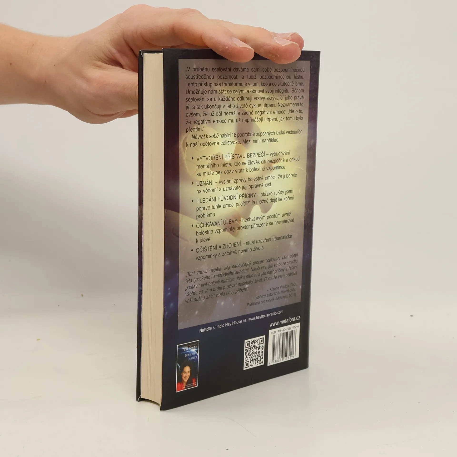 Teal Swan prožila léta zneužívání rodinným známým, členem tajné místní náboženské sekty, než se jí podařilo v devatenácti letech uprchnout a zahájit proces vlastního uzdravování a transformace. Návrat k sobě zve čtenáře na tuto povzbuzující cestu za uzdravením a osvobozením. Každý, kdo byl kdy zasažen traumatem, zde nalezne způsob, jak znovu poskládat sebe sama bez zatížení minulostí. Na základě svých vrozených mimosmyslových zkušeností a s použitím psychoterapeutických metod sestavila Teal Swan revoluční proces scelování, který člověka vede ke smíření se sebou, s ostatními a s vnějšími okolnostmi. K zásadním krokům na této cestě například patří: * Vytvoření přístavu bezpečí – vybudování mentálního místa, kde se člověk cítí bezpečně a odkud se může bez obav vrátit k bolestné vzpomínce * Uznání – vyslání zprávy bolestné emoci, že ji berete na vědomí a uznáváte její oprávněnost * Hledání původní příčiny – otázkou „Kdy jsem poprvé tuhle emoci pocítil?“ je možné dojít ke kořeni problému * Očekávání úlevy – nechat svým pocitům uvnitř bolestné vzpomínky prostor přirozeně se nasměrovat k úlevě * Očištění a zhojení – rituál uzavření traumatické vzpomínky a začátek nového života Návrat k sobě zanechá ve čtenáři silnější vědomí vlastní hodnoty ve světě a jistotu, že život může být zase dobrý.