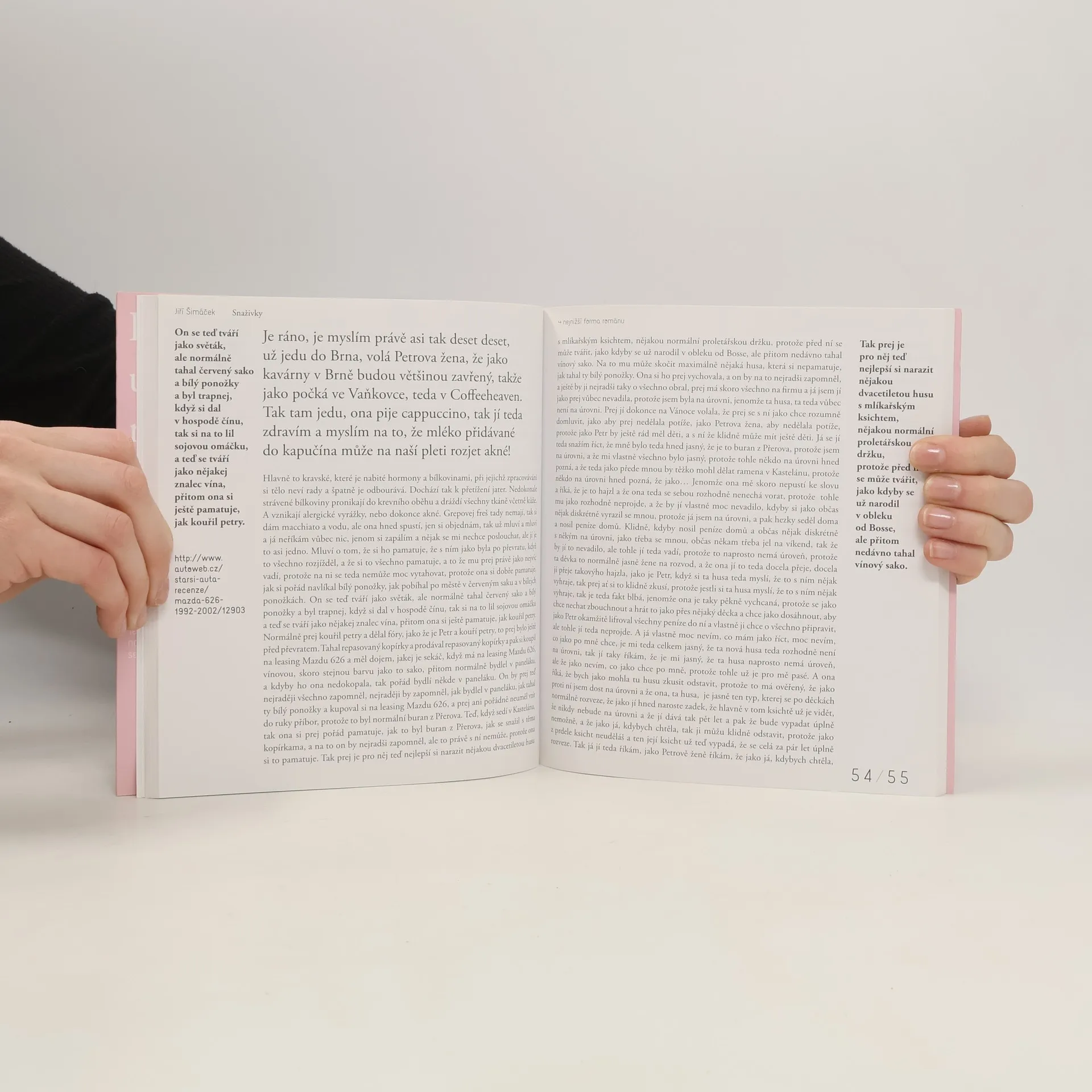 Naše bezejmenná hrdinka rozhodně není žádná blbka ani trapka. A už vůbec ne nějaká přeléčená venkovanka, jako její kamarádka Renča, která si zásadně objednává mačiato. Bydlí v Brně a živí se jako kosmetička. Je naprosto profi a občas zajede za rodiči do Boskovic. Chce kluka, kterej bude v balíku. Je to jasný?