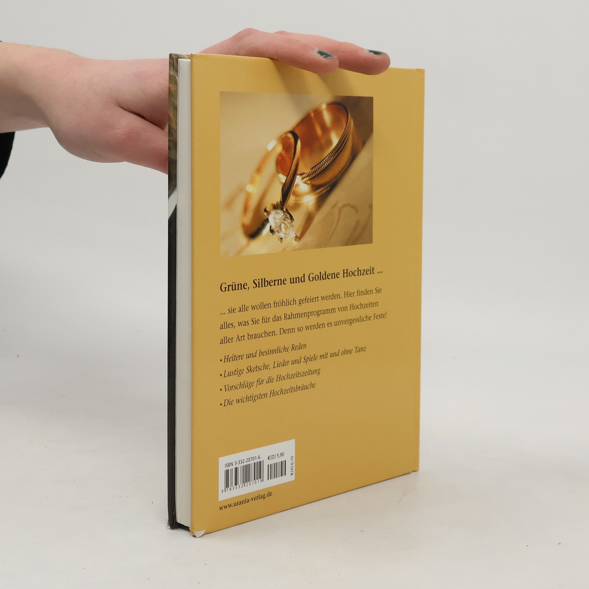 Alles für eine gelungene Hochzeitsfeier, egal ob Grüne, Silberne oder Goldene Hochzeit. Sketche, Lieder, Spiele, Reden, alte und neue Hochzeitsbräuche sowie die Hochzeitszeitung. In diesem Buch finden Sie alles, was Sie für das Rahmenprogramm der Feier von Grünen, Silber- sowie Goldenen Hochzeiten brauchen. Heitere und besinnliche Reden, lustige Sketche, Lieder und Spiele gehören ebenso dazu wie die wieder belebten, alten Bräuche und die fast unerlässliche Hochzeitszeitung
