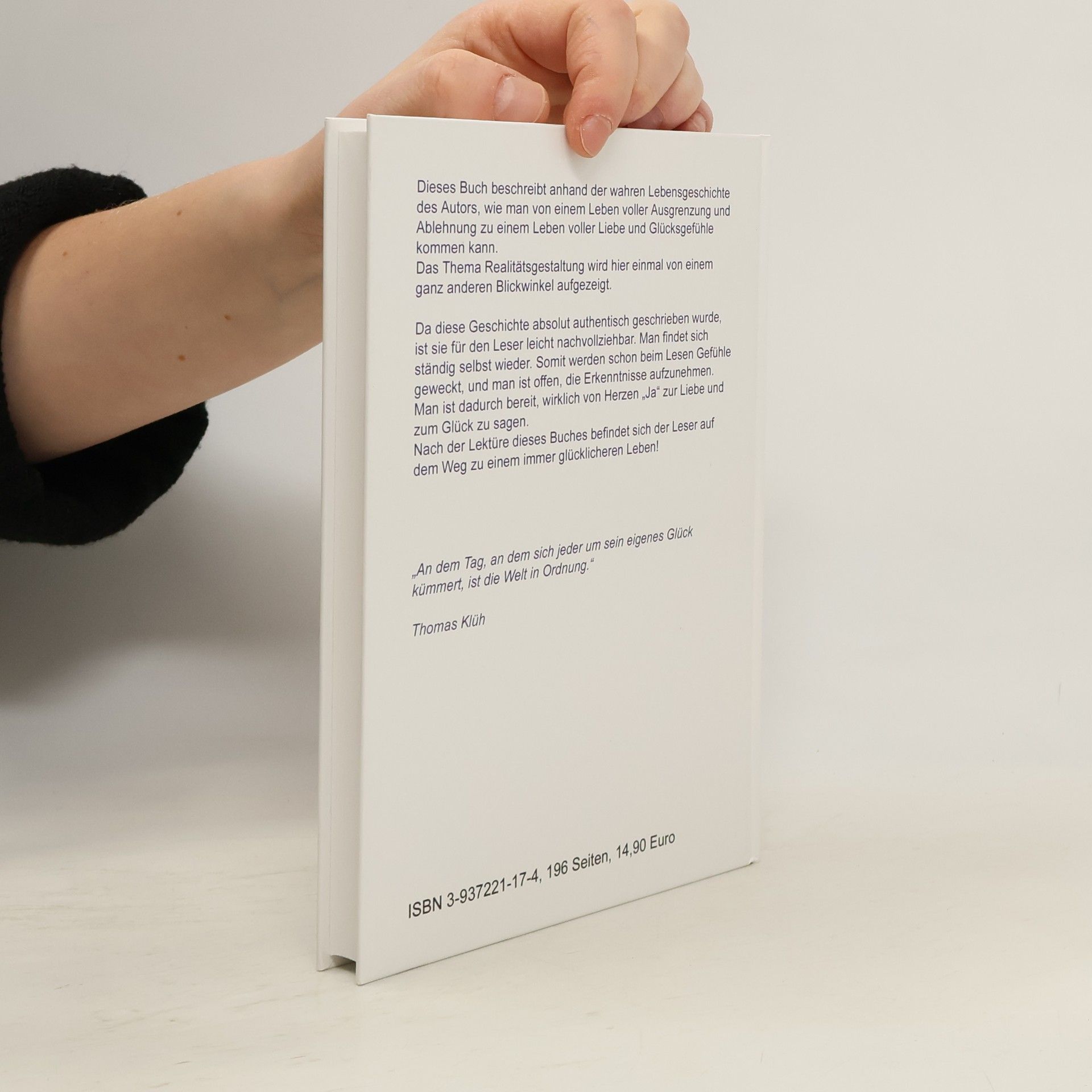 Dieses Buch beschreibt anhand der wahren Lebensgeschichte des Autors, wie man von einem Leben voller Ausgrenzung und Ablehnung zu einem Leben voller Liebe und Glücksgefühle kommen kann. Das Thema Realitätsgestaltung wird hier einmal von einem ganz anderen Blickwinkel aufgezeigt. Da diese Geschichte absolut authentisch geschrieben wurde, ist sie für den Leser leicht nachvollziehbar. Man findet sich ständig selbst wieder. Somit werden schon beim Lesen Gefühle geweckt, und man ist offen, die Erkenntnisse aufzunehmen. Man ist dadurch bereit, wirklich von Herzen „Ja“ zur Liebe und zum Glück zu sagen. Nach der Lektüre dieses Buches befindet sich der Leser auf dem Weg zu einem immer glücklicheren Leben! „An dem Tag, an dem sich jeder um sein eigenes Glück kümmert, ist die Welt in Ordnung.“ Thomas Klüh