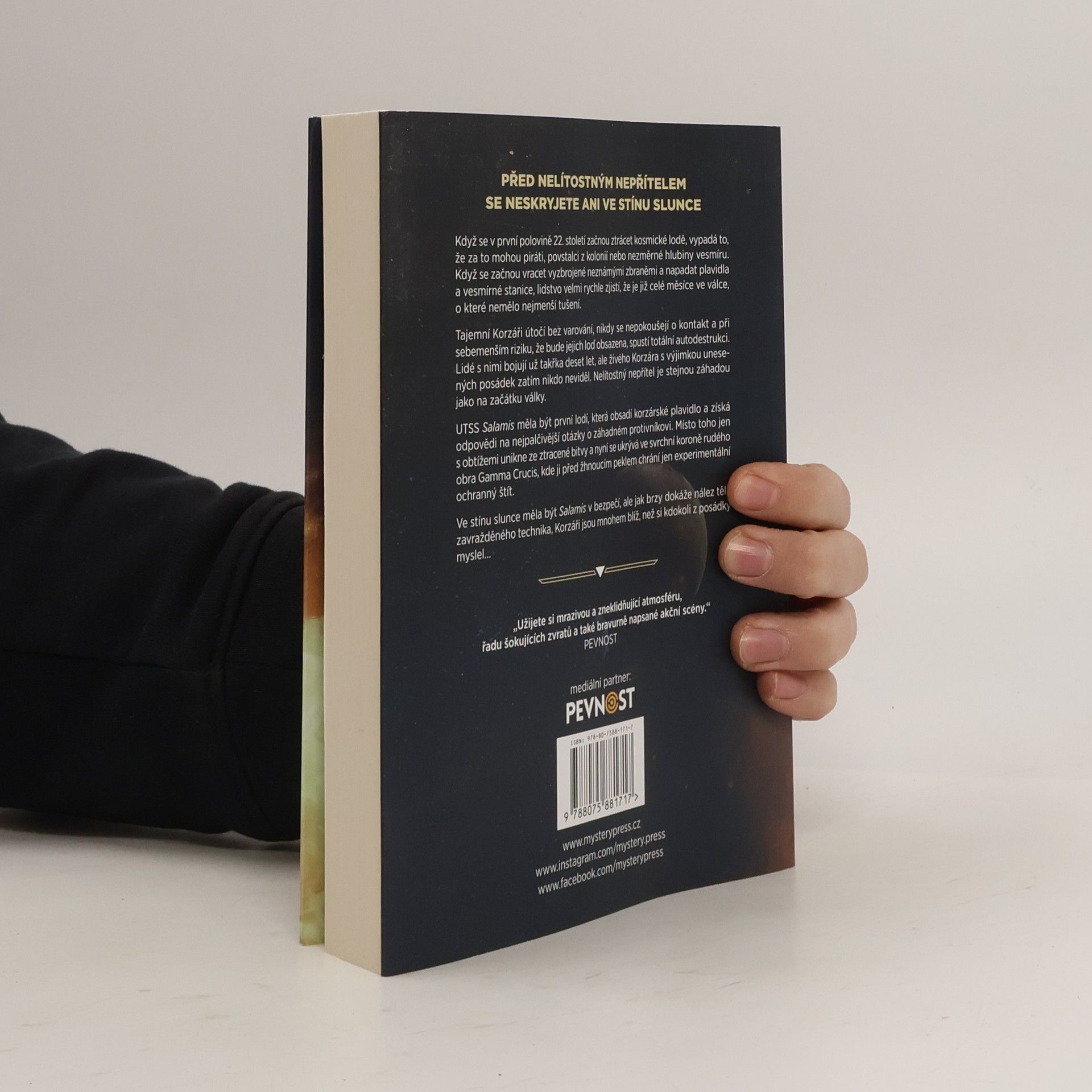 PŘED NELÍTOSTNÝM NEPŘÍTELEM SE NESKRYJETE ANI VE STÍNU SLUNCE Když se v první polovině 22. století začnou ztrácet kosmické lodě, vypadá to, že za to mohou piráti, povstalci z kolonií nebo nezměrné hlubiny vesmíru. Když se začnou vracet vyzbrojené neznámými zbraněmi a napadat plavidla a vesmírné stanice, lidstvo velmi rychle zjistí, že je již celé měsíce ve válce, o které nemělo nejmenší tušení. Tajemní Korzáři útočí bez varování, nikdy se nepokoušejí o kontakt a při sebemenším riziku, že bude jejich loď obsazena, spustí totální autodestrukci. Lidé s nimi bojují už takřka deset let, ale živého Korzára s výjimkou unesených posádek zatím nikdo neviděl. Nelítostný nepřítel je stejnou záhadou jako na začátku války. UTSS Salamis měla být první lodí, která obsadí korzárské plavidlo a získá odpovědi na nejpalčivější otázky o záhadném protivníkovi. Místo toho jen s obtížemi unikne ze ztracené bitvy a nyní se ukrývá ve svrchní koroně rudého obra Gamma Crucis, kde ji před žhnoucím peklem chrání jen experimentální ochranný štít. Ve stínu slunce měla být Salamis v bezpečí, ale jak brzy dokáže nález těla zavražděného technika, Korzáři jsou mnohem blíž, než si kdokoli z posádky myslel… _________________ „Užijete si mrazivou a zneklidňující atmosféru, řadu šokujících zvratů a také bravurně napsané akční scény.“ – PEVNOST