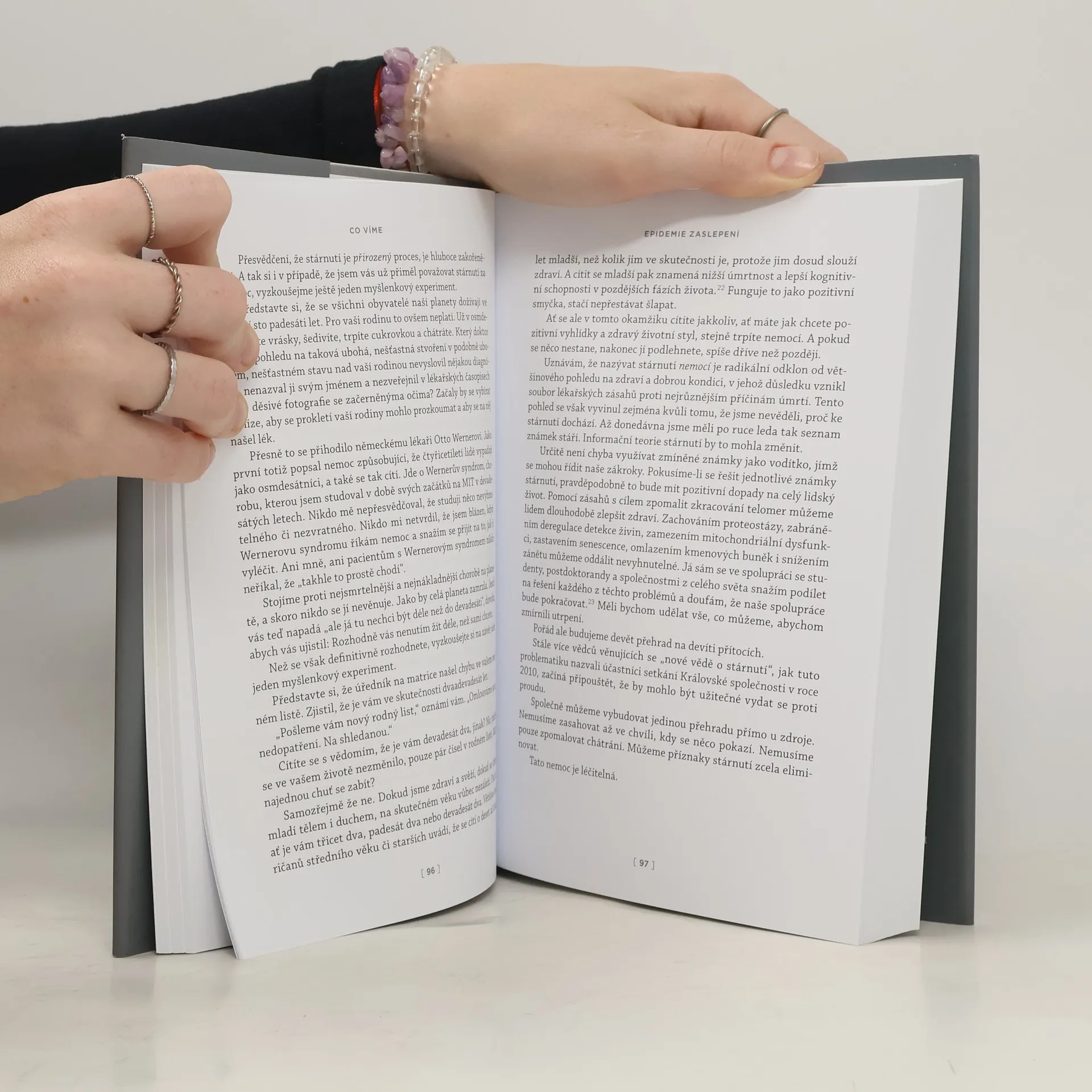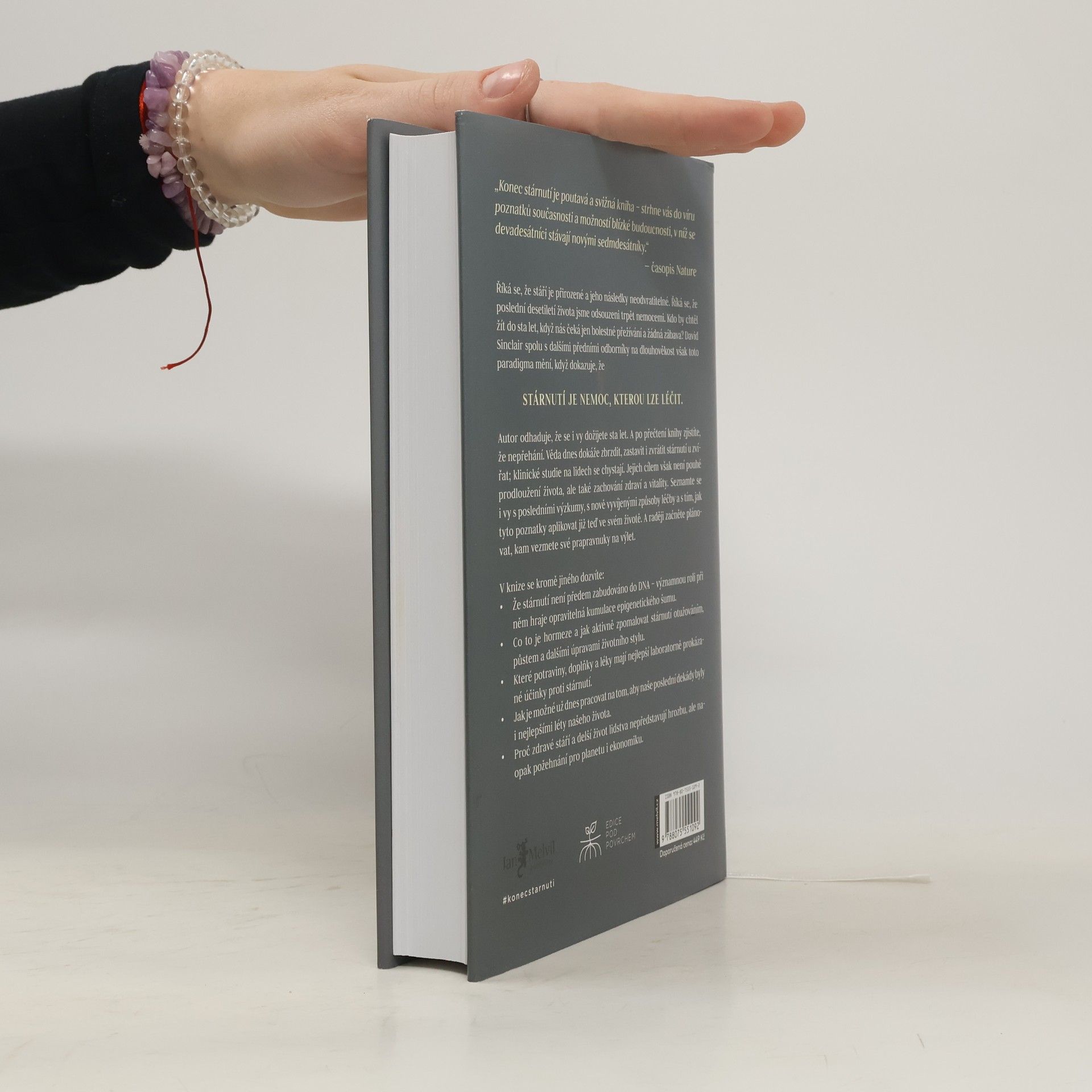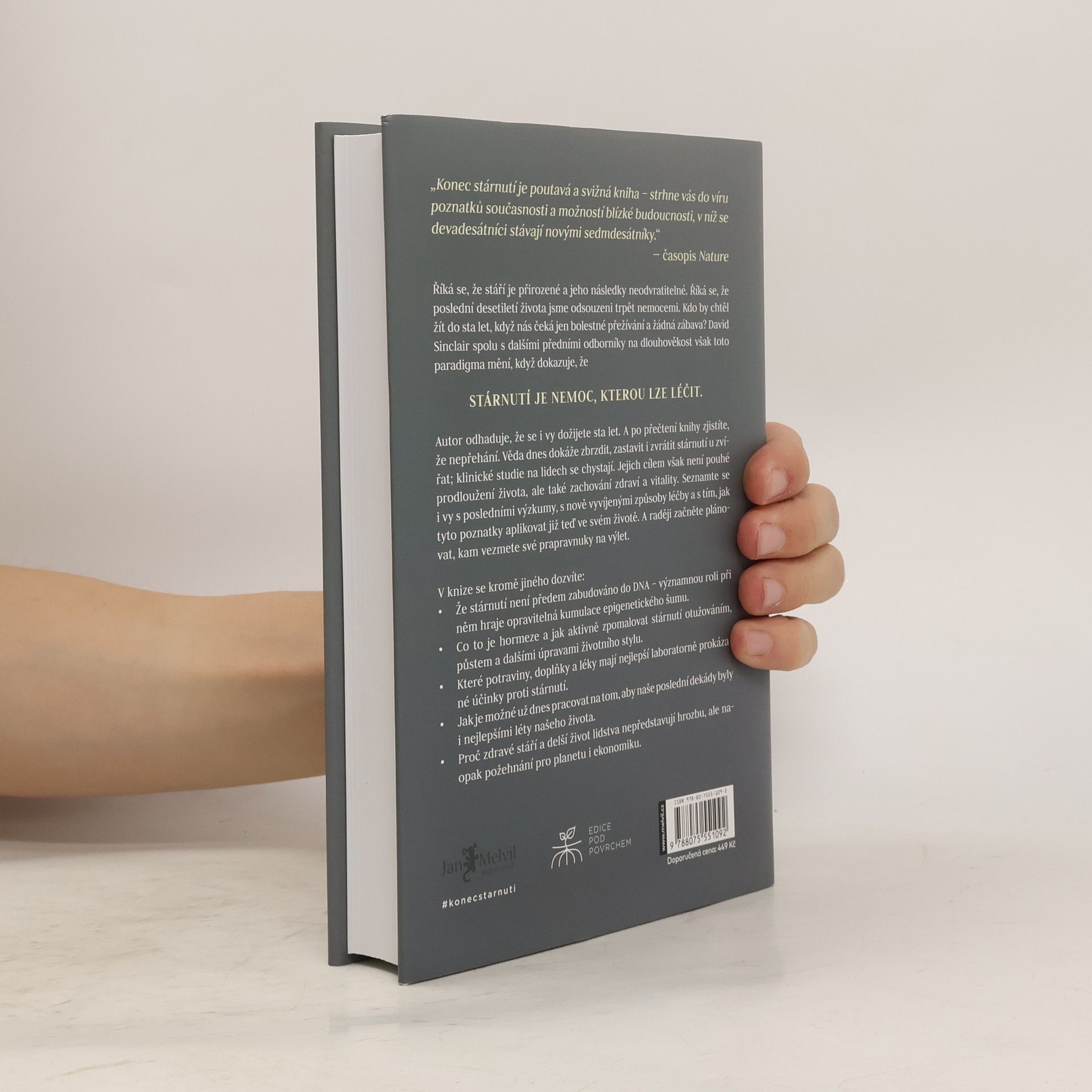 Říká se, že stáří je přirozené a jeho následky neodvratitelné. Říká se, že poslední desetiletí života jsme odsouzeni trpět nemocemi. Kdo by chtěl žít do sta let, když nás čeká jen bolestné přežívání a žádná zábava? David Sinclair spolu s dalšími předními odborníky na dlouhověkost však toto paradigma mění, když dokazuje, že STÁRNUTÍ JE NEMOC, KTEROU LZE LÉČIT. Autor odhaduje, že se i vy dožijete sta let. A po přečtení knihy zjistíte, že nepřehání. Věda dnes dokáže zbrzdit zastavit i zvrátit stárnutí zvířat, klinické studie na lidech se chystají. Jejich cílem však není pouhé prodloužení života, ale také zachování zdraví a vitality. Seznamte se i vy s posledními výzkumy, s nově vyvíjenými způsoby léčby a s tím, jak tyto poznatky aplikovat již teď ve svém životě. A raději začněte plánovat, kam vezmete své prapravnuky na výlet. V knize se mimo jiné dozvíte - Že stárnutí není předem zabudováno do DNA – významnou roli při něm hraje opravitelná kumulace epigenetického šumu. - Co je to hormeze a jak aktivně zpomalovat stárnutí otužováním, půstem a dalšími úpravami životního stylu. - Které potraviny, doplňky a léky mají nejlepší laboratorně prokázané účinky proti stárnutí. - Jak je možné už dnes pracovat na tom, aby naše poslední dekády byly i nejlepšími léty našeho života. - Proč zdravé stáří a delší život lidstva nepředstavují hrozbu, ale naopak požehnání pro planetu i ekonomiku.