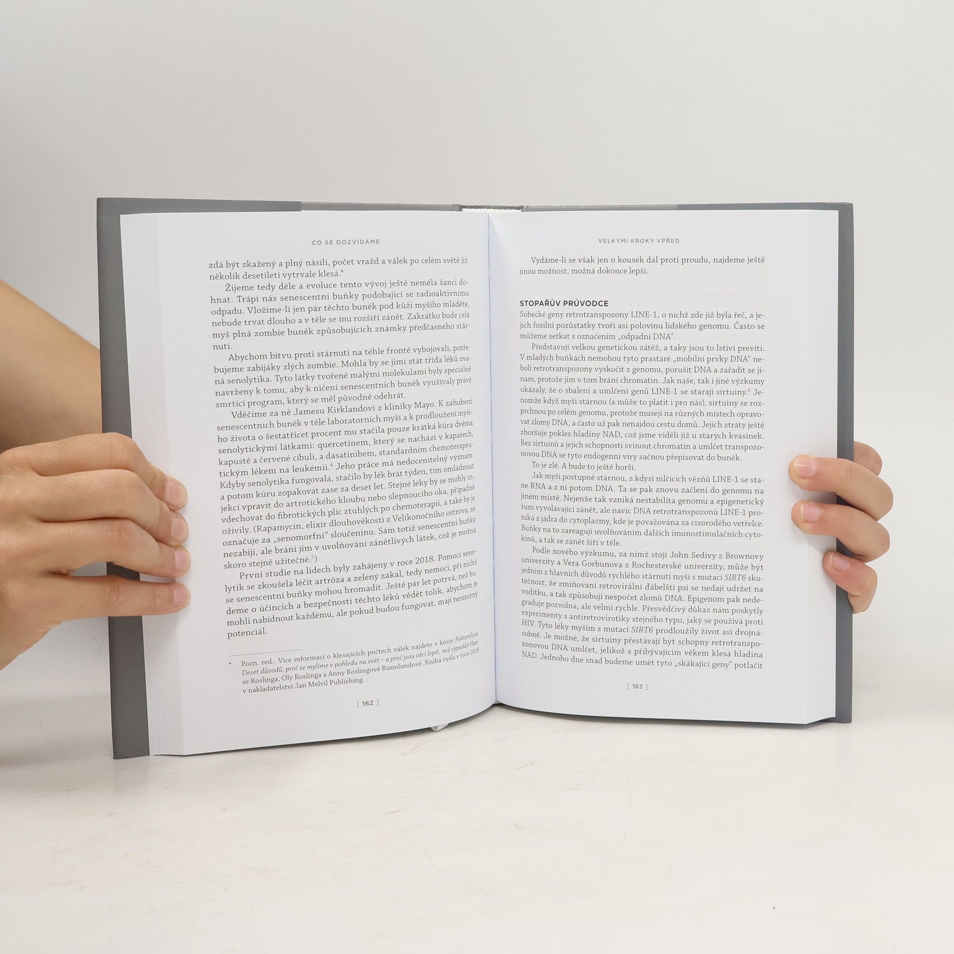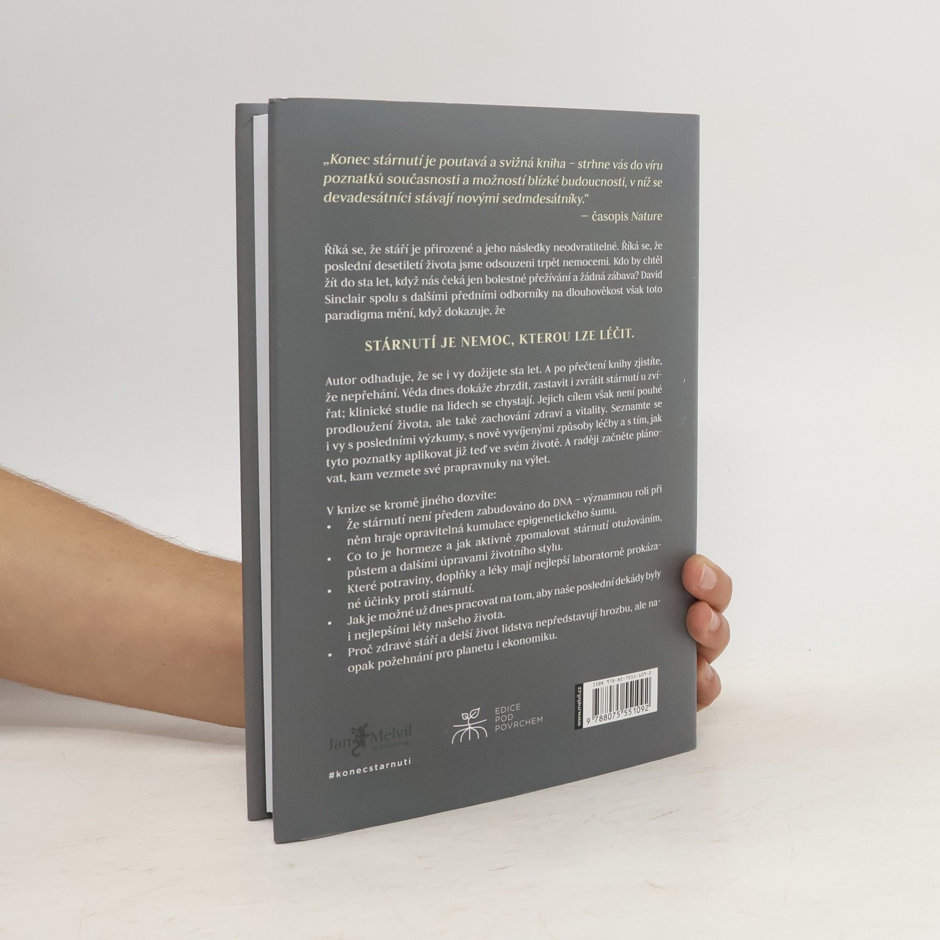 Říká se, že stáří je přirozené a jeho následky neodvratitelné. Říká se, že poslední desetiletí života jsme odsouzeni trpět nemocemi. Kdo by chtěl žít do sta let, když nás čeká jen bolestné přežívání a žádná zábava? David Sinclair spolu s dalšími předními odborníky na dlouhověkost však toto paradigma mění, když dokazuje, že STÁRNUTÍ JE NEMOC, KTEROU LZE LÉČIT. Autor odhaduje, že se i vy dožijete sta let. A po přečtení knihy zjistíte, že nepřehání. Věda dnes dokáže zbrzdit zastavit i zvrátit stárnutí zvířat, klinické studie na lidech se chystají. Jejich cílem však není pouhé prodloužení života, ale také zachování zdraví a vitality. Seznamte se i vy s posledními výzkumy, s nově vyvíjenými způsoby léčby a s tím, jak tyto poznatky aplikovat již teď ve svém životě. A raději začněte plánovat, kam vezmete své prapravnuky na výlet. V knize se mimo jiné dozvíte - Že stárnutí není předem zabudováno do DNA – významnou roli při něm hraje opravitelná kumulace epigenetického šumu. - Co je to hormeze a jak aktivně zpomalovat stárnutí otužováním, půstem a dalšími úpravami životního stylu. - Které potraviny, doplňky a léky mají nejlepší laboratorně prokázané účinky proti stárnutí. - Jak je možné už dnes pracovat na tom, aby naše poslední dekády byly i nejlepšími léty našeho života. - Proč zdravé stáří a delší život lidstva nepředstavují hrozbu, ale naopak požehnání pro planetu i ekonomiku.