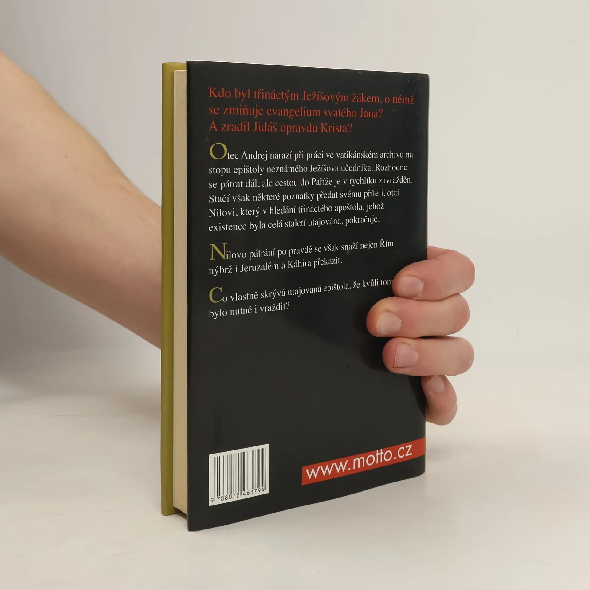 Otec Andrej, zavražděný v rychlíku na trati mezi Římem a Paříží, právě odhalil tajemství, jehož zveřejnění by bezpochyby otřáslo celou civilizací a které se církev od svého založení snaží skrývat. Jeho přítel, otec Nil, v pátrání po stopách jednoho Ježíšova druha a jeho epištoly pokračuje. V tom se mu však snaží zabránit nejen Řím, nýbrž i Jeruzalém a Káhira. Co vlastně skrývá utajovaná epištola, že kvůli tomu bylo nutné i vraždit?