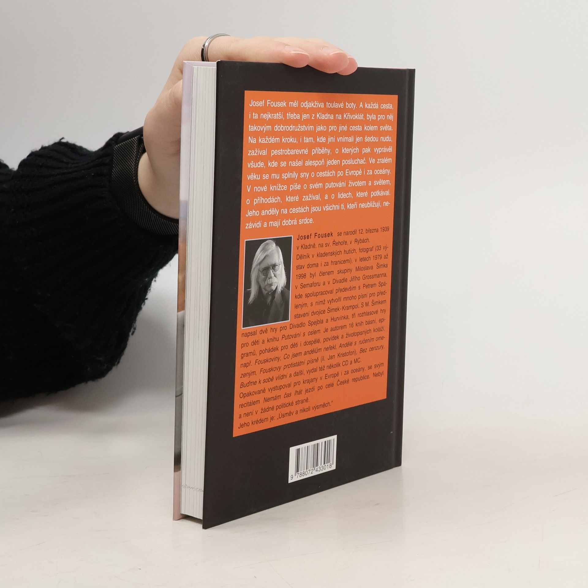 Josef Fousek měl odjakživa toulavé boty. A každá cesta, i ta nejkratší, třeba jen z Kladna na Křivoklát, byla pro něj takovým dobrodružstvím jako pro jiné cesta kolem světa. Na každém kroku, i tam, kde jiní vnímali jen šedou nudu, zažíval pestrobarevné příběhy, o kterých pak vyprávěl všude, kde se našel alespoň jeden posluchač. Ve zralém věku se mu splnily sny o cestách po Evropě i za oceány. V nové knížce píše o svém putování životem a světem, o příhodách, které zažíval, a o lidech, které potkával. Jeho anděly na cestách jsou všichni ti, kteří neubližují, nezávidí a mají dobrá srdce.