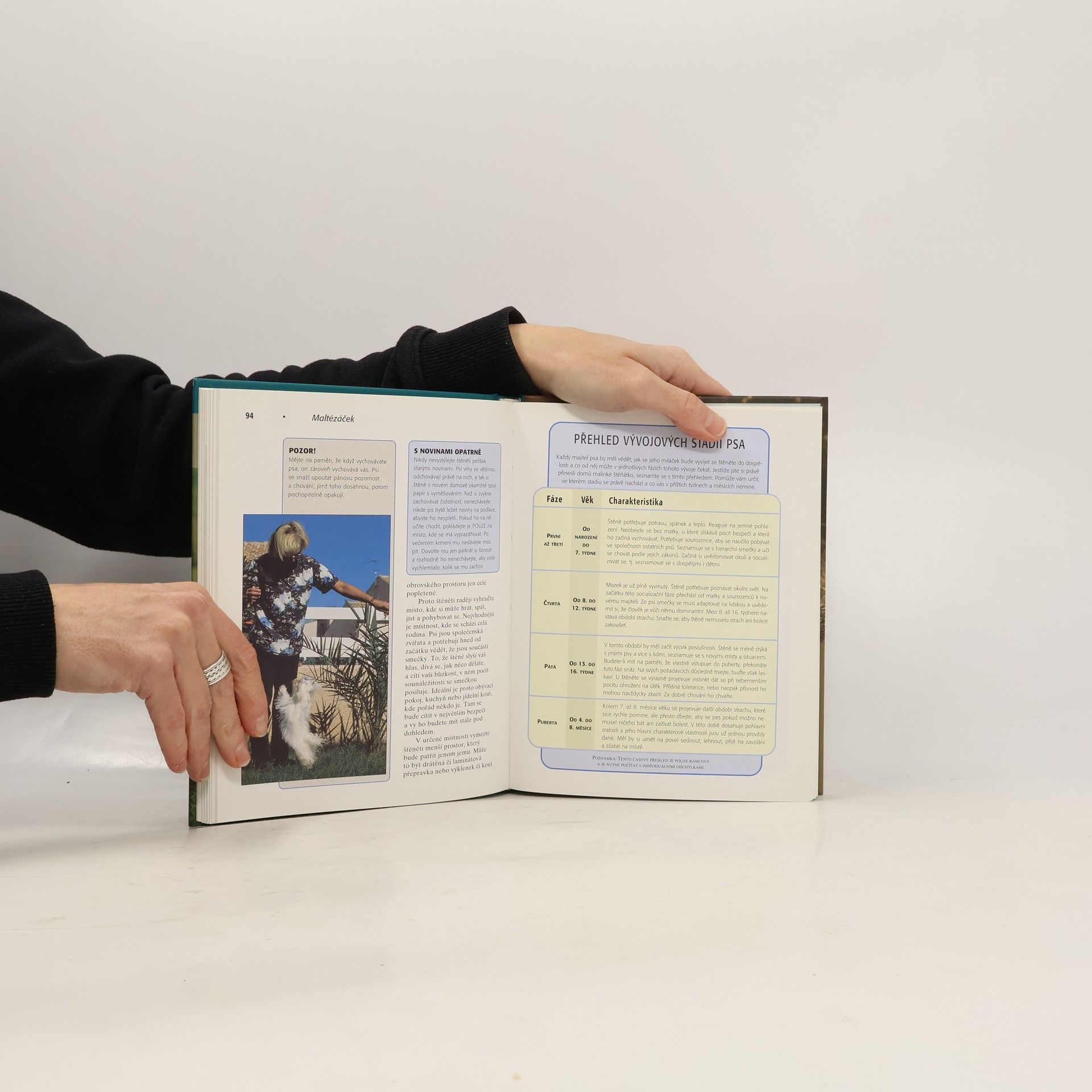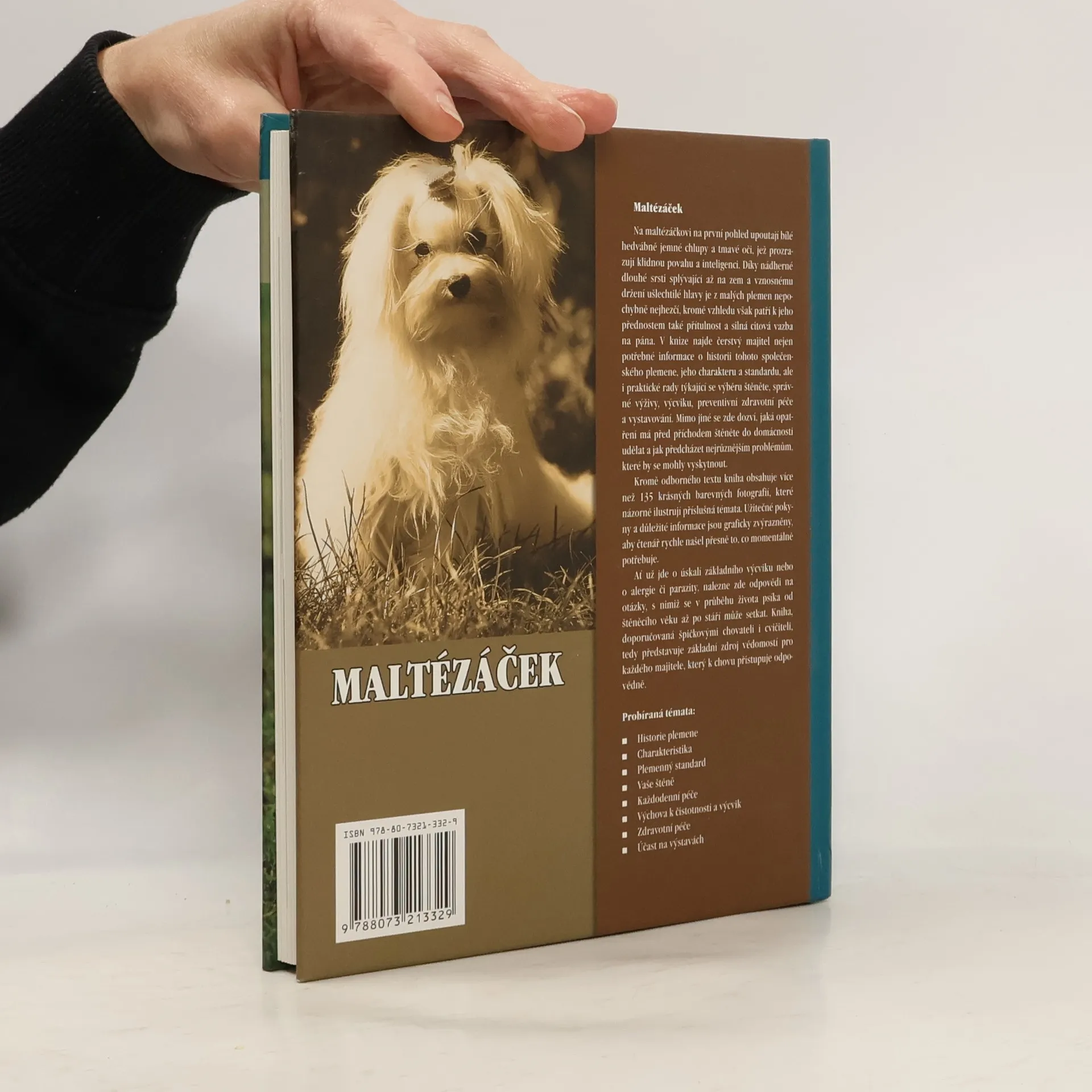 Na maltézáčkovi na první pohled upoutají bílé hedvábně jemné chlupy a tmavé oči,jež prozrazují klidnou povahu a inteligenci. Díky nádherné dlouhé srsti splývající až na zem a vznosnému držení hlavy je z malých plemen nepochybně nejhezčí, kromě vzhledu však patří k jeho přednostem také přítulnost a silná citová vazba na pána. V knize najde čerstvý majitel nejen potřebné informace o historii tohoto společenského plemene, jeho charakteru a standardu, ale i praktické rady týkající se výběru štěněte, správné výživy, výcviku, preventivní zdravotní péče a vystavování. Mimo jiné se zde dozvíte, jaká opatření má před příchodem štěněte do domácnosti udělat a jak předcházet nejrůznějším problémům, které by se mohly vyskytnout.