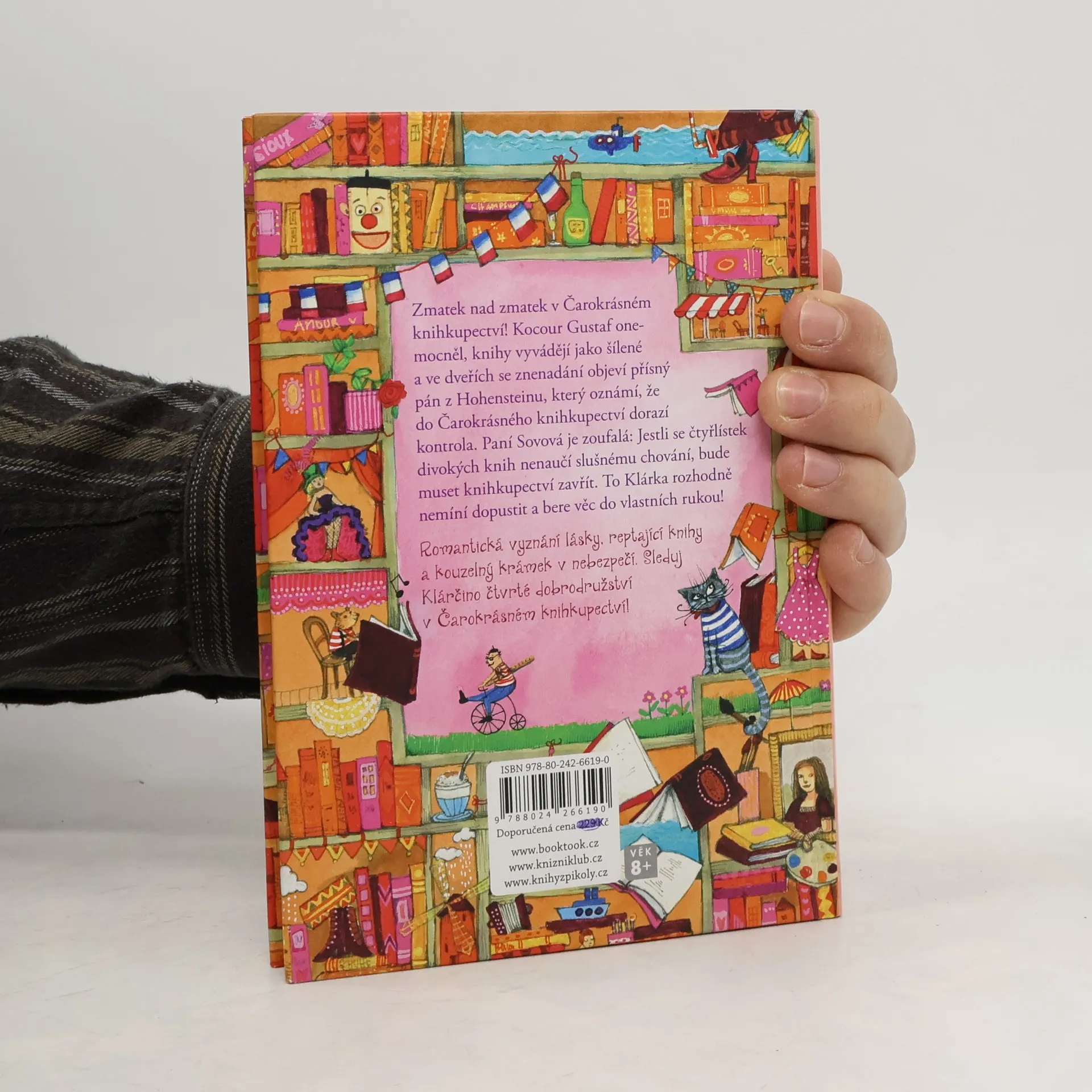 Zmatek nad zmatek v Čarokrásném knihkupectví! Kocour Gustaf onemocněl, knihy vyvádějí jako šílené a do obchůdku má dorazit kontrola! Paní Sovová je zoufalá: Jestli se čtyřlístek divokých knih nenaučí slušnému chování, bude muset knihkupectví zavřít. To Klárka rozhodně nemíní dopustit a bere věc do vlastních rukou! Romantická vyznání lásky, reptající knihy a Čarokrásné knihkupectví v nebezpečí. Sleduj Klárčino čtvrté dobrodružství. Kniha je určena dětem od 8 let.