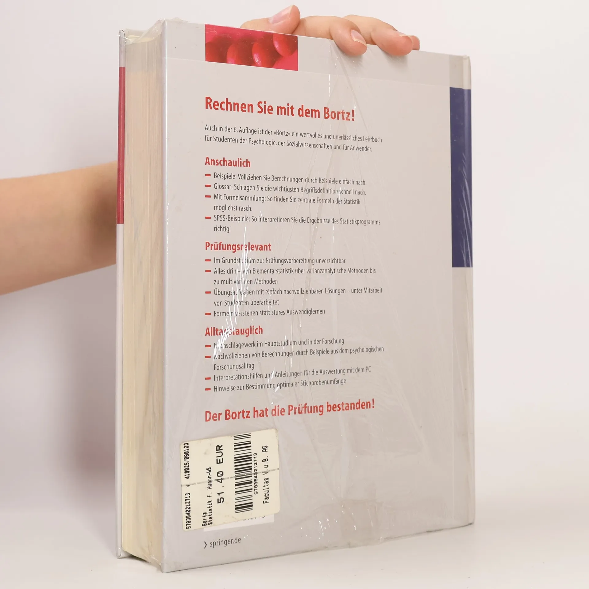 Rechnen Sie mit dem Bortz!Auch in der 6. Auflage ist der BORTZ ein wertvolles und unerlAssliches Lehrbuch fA1/4r Studenten der Psychologie, der Sozialwissenschaften und fA1/4r Anwender.Anschaulich- Vollziehen Sie Berechnungen durch Beispiele einfach nach.- Schlagen Sie die wichtigsten Begriffsdefinition schnell nach.- Mit So finden Sie zentrale Formeln der Statistik mAglichst rasch.- So interpretieren Sie die Ergebnisse des Statistikprogramms richtig.PrA1/4fungsrelevant- Im Grundstudium zur PrA1/4fungsvorbereitung unverzichtbar- Alles drin a " von Elementarstatistik A1/4ber varianzanalytische Methoden bis zu multivariaten Methoden- Aoebungsaufgaben mit einfach nachvollziehbaren LAsungen a " unter Mitarbeit von Studenten A1/4berarbeitet.- Formeln verstehen statt stures AuswendiglernenAlltagstauglich- Nachschlagewerk im Hauptstudium und in der Forschung- Nachvollziehen von Berechnungen durch Beispiele aus dem psychologischen Forschungsalltag- Interpretationshilfen und Anleitungen fA1/4r die Auswertung mit dem PC- Hinweise zur Bestimmung optimaler StichprobenumfAngeDer Bortz hat die PrA1/4fung bestanden!