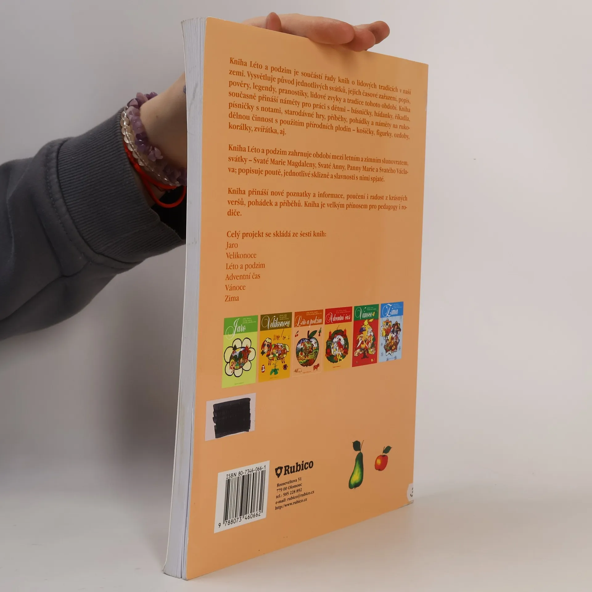Výborná kniha z edice o lidových tradicích a zvycích v naší zemi. Jedná se o šest samostatných publikací: Zima, Jaro, Velikonoce, Léto a podzim, Adventní čas, Vánoce. V knize naleznete: charakteristiku období, pověry, legendy, pranostiky, lidové zvyklosti a tradice, jejich původ a využití v práci s dětmi - básničky, hádanky, lidová vinšování a říkadla, písničky, povídky, pohádky a náměty pro rukodělnou činnost. Období zahrnuje světce a zvyklosti: Svatá Magdalena, Svatá Anna, Panna Maria, Svatý Václav, dožínky, dočesná, vinobraní, len a konopí, brambory, řepa, ovoce a zelenina, poutě. Můžete se s knihou naučit starodávné dětské hry s míčem, blechou a špačkem
