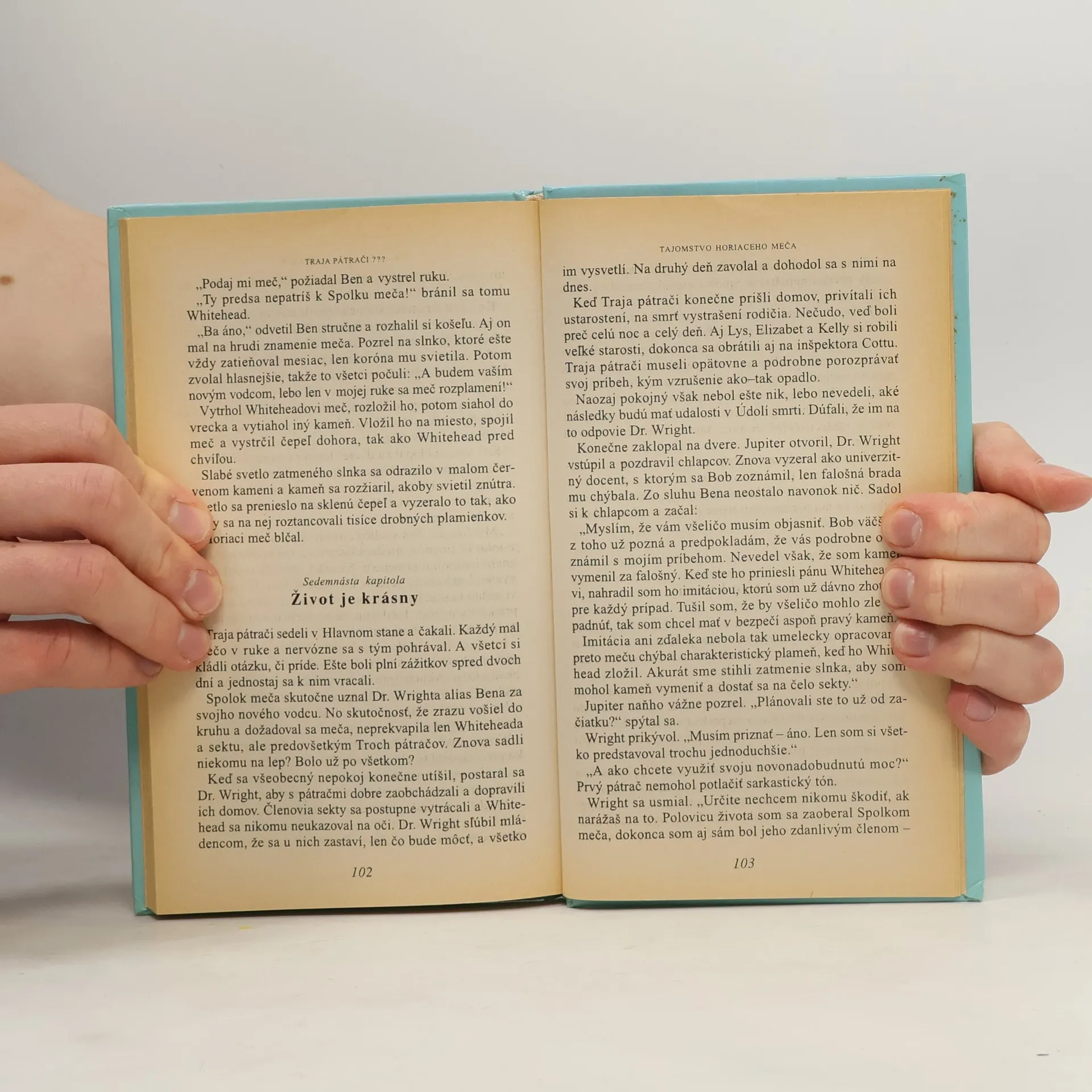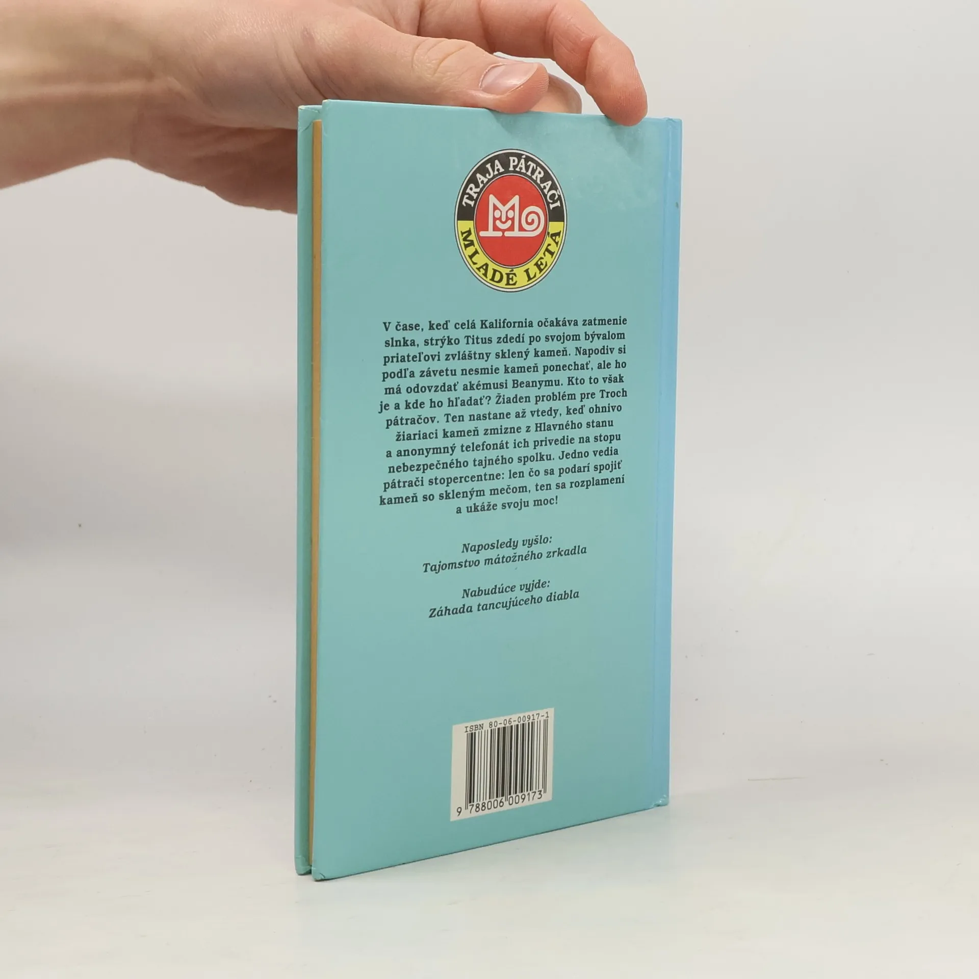 V čase, keď celá Kalifornia očakáva zatmenie slnka, strýko Titus zdedí po svojom bývalom priateľovi zvláštny sklený kameň. Napodiv si podľa závetu nesmie kameň ponechať, ale ho má odovzdať akémusi Beanymu. Kto to však je a kde ho má hľadať ? Žiaden problém pre Troch pátračov. Ten nastane až vtedy, keď ohnivo žiariaci kameň zmizne z Hlavného stanu a anonymný telefonát ich privedie na stopu nebezpečného tajného spolku. Jedno vedia pátrači stopercentne. Len čo sa podarí spojiť kameň so skleným mečom, ten sa rozplamení a ukáže svoju moc !