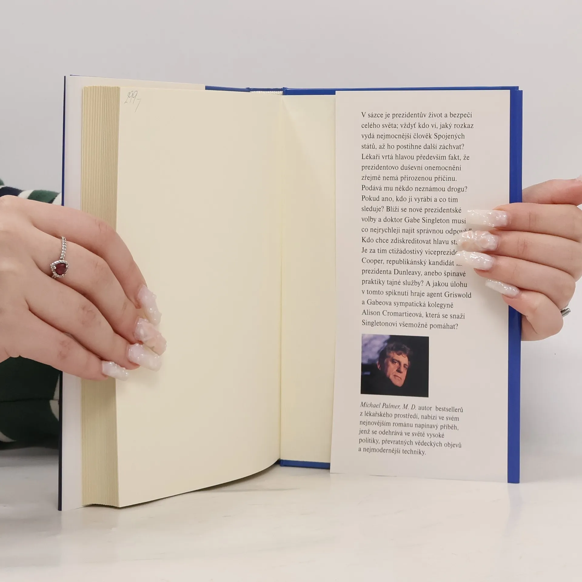 Jednoho dne přistane na Gabeově ranči ve Wyomingu prezidentova helikoptéra a dávný přítel dnes prezident Spojených států přednese lékaři nečekanou žádost: prezidentův osobní lékař za záhadných okolností zmizel a prezident teď chce, aby Singleton nastoupil na jeho místo. Navzdory svým vážným pochybnostem, zda úkol zvládne, Gabe příteli na nabídku kývne. Blíží se nové prezidentské volby a doktor Gabe Singleton musí co nejrychleji najít správnou odpověď. Kdo chce zdiskreditovat hlavu státu? Je za tím ctižádostivý viceprezident Cooper nebo špinavé praktiky tajné služby? Michael Palmer, M. D., autor bestsellerů z lékařského prostředí, nabízí ve svém nejnovějším románu napínavý příběh, jenž se odehrává ve světě vysoké politiky, převratných vědeckých objevů a nejmodernější techniky