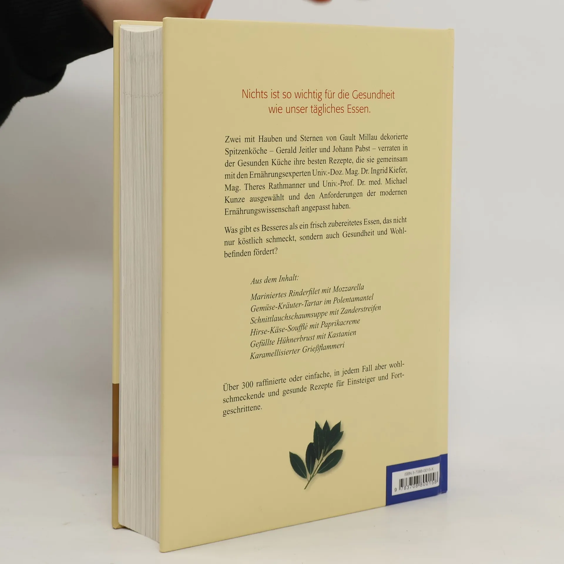 Die gesunde Küche ist das erste Kochbuch, das Rezepte von Spitzenköchen enthält, die den Anforderungen der modernen Ernährungswissenschaft gerecht werden. Johann Pabst, Chefkoch im *****Thermenhotel Der Steirerhof in Bad Waltersdorf und Gerald Jeitler, Chefkoch im ****Hotel Sonnenpark in Lutzmannsburg entwickelten gemeinsam mit den renommierten Ernährungsexperten Ingrid Kiefer, Theres Rathmanner und Michael Kunze mehr als 300 kulinarische Rezepte mit Gesundheitswert.