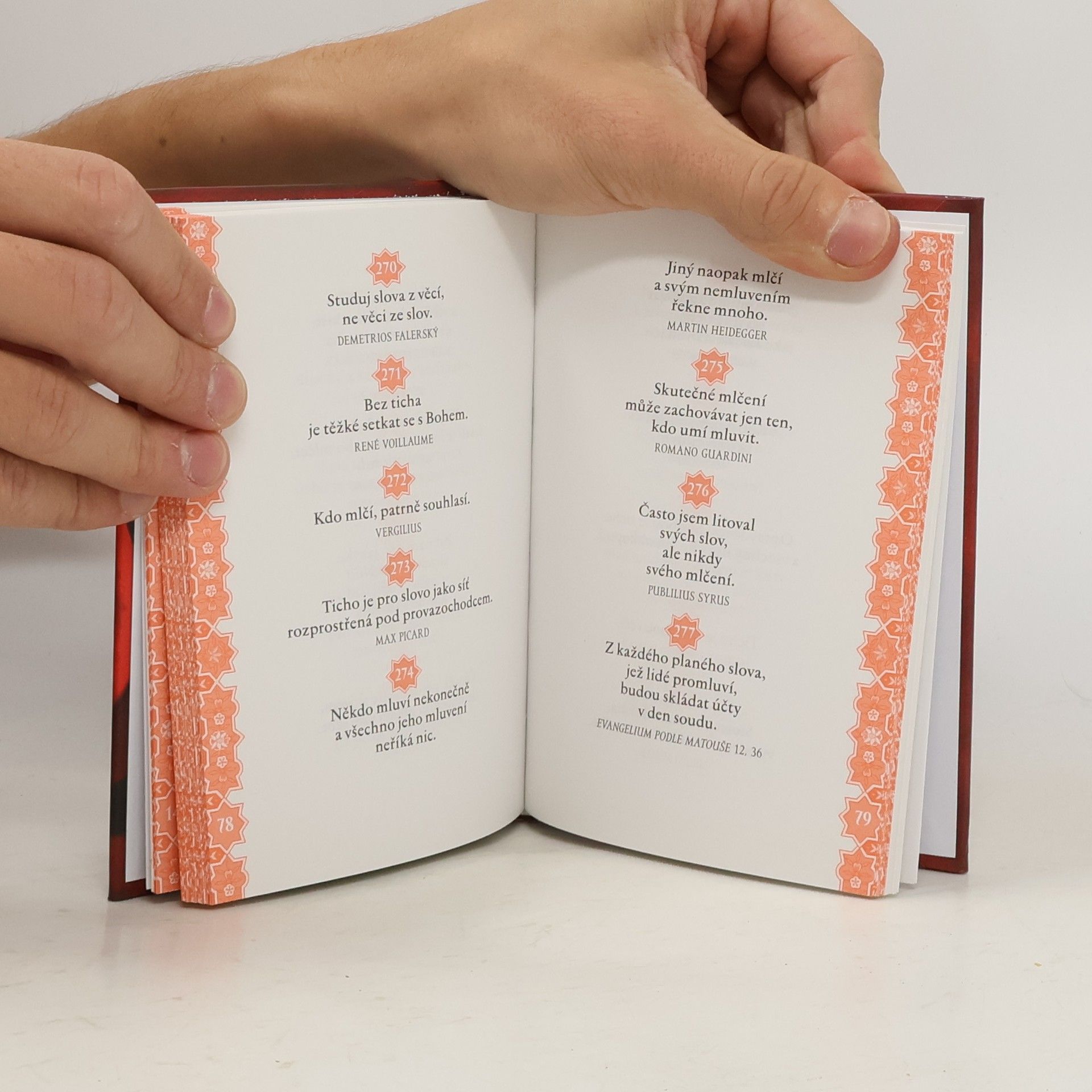 Knížka obsahuje citáty (moudré, humorné, satirické, podněcující k zamyšlení) známých osobností z různých období a různých zemí na téma ticho a mlčení. V dnešním světě je málo místa pro ticho, podstatnou podmínku, jak se naučit umění naslouchat. Mnoho lidí, vyčerpaných ohlušujícím povykem moderního života, blahodárné účinky „ticha, které léčí“, ocení. Podle švýcarského spisovatele M. Picarda „člověk, jenž ztratil ticho, nejenže ztratil svou podstatu, ale změnil se v celé své struktuře“. Myšlenky, které jsou shromážděny v tomto svazku, chtějí pomoci čtenáři umlčet hluk vnějšího světa, aby bylo možné udělat místo naslouchání vnitřnímu hlasu.