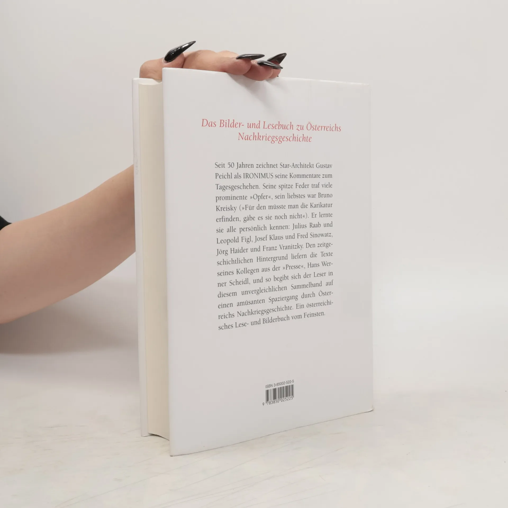 Das Bilder- und Lesebuch zu Österreichs Nachkriegsgeschichte Seit 50 Jahren zeichnet Star-Architekt Gustav Peichl als IRONIMUS seine Kommentare zum Tagesgeschehen. Seine spitze Feder traf viele prominente „Opfer“, sein liebstes war Bruno Kreisky („Für den müsste man die Karikatur erfinden, gäbe es sie noch nicht“). Er lernte sie alle persönlich kennen: Julius Raab und Leopold Figl, Josef Klaus und Fred Sinowatz, Jörg Haider und Franz Vranitzky. Den zeitgeschichtlichen Hintergrund liefern die Texte seines Kollegen aus der „Presse“, Hans Werner Scheidl, und so begibt sich der Leser in diesem unvergleichlichen Sammelband auf einen amüsanten Spaziergang durch Österreichs Nachkriegsgeschichte. Ein österreichisches