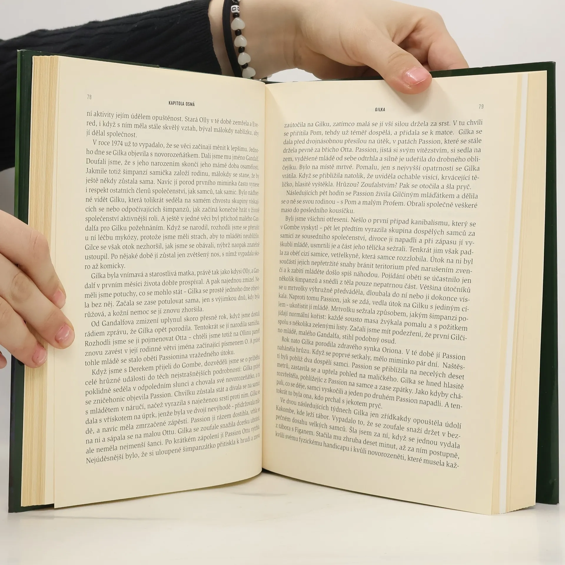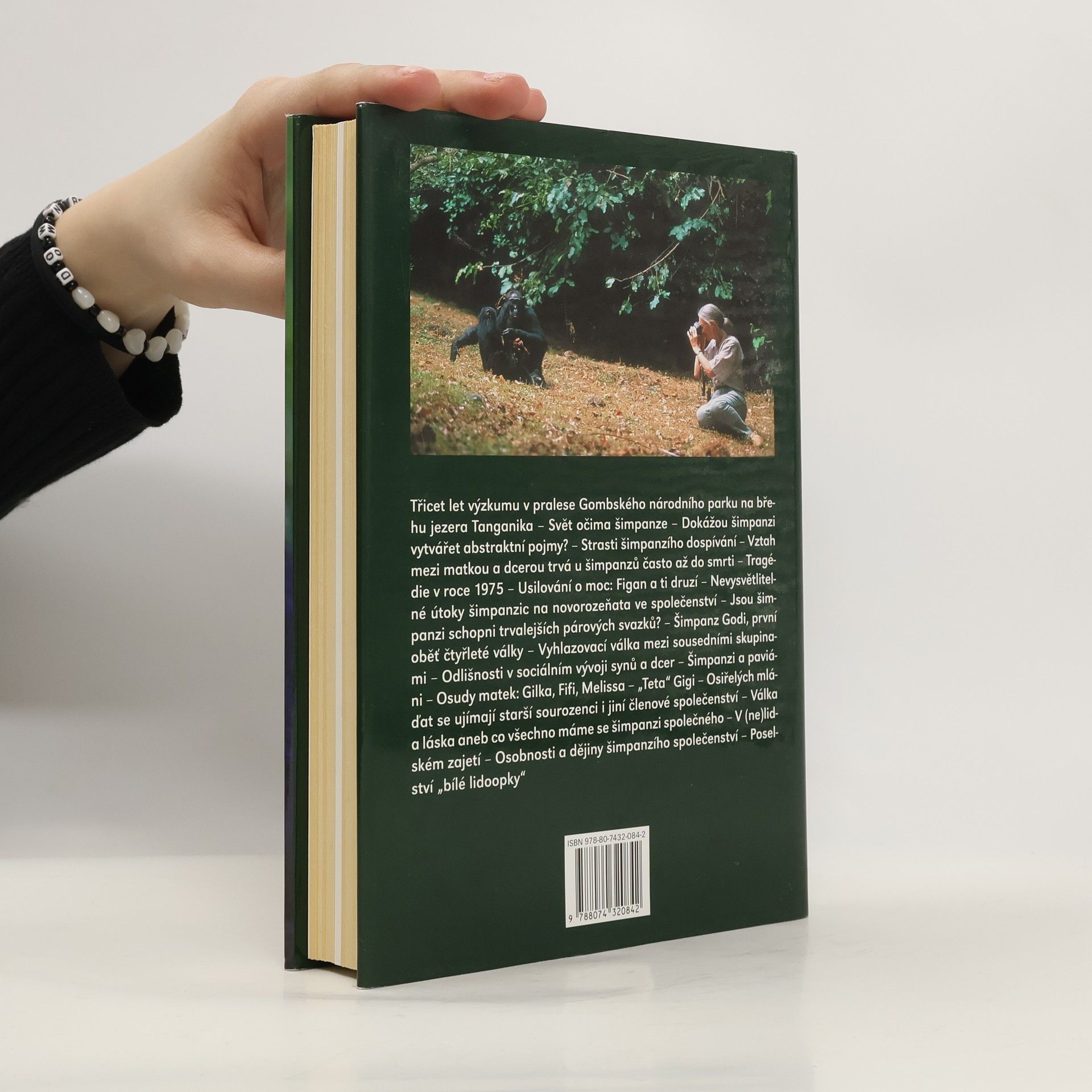 Podtitul: Třicet let se šimpanzi v rezervaci Gombe. Významná, světově proslulá etoložka se ohlíží za svým třicetiletým působením v Africe a podává ságu volně žijících šimpanzů, jejichž studiu se věnovala. Za svého dlouholetého výzkumu odkryla mnoho z jejich života, ale také ukázala, že o nich ještě stále všechno nevíme, například o jejich agresivitě, hloubce jejich starostlivosti či míře jejich vcítění. Šimpanzi, naši nejbližší příbuzní, nám ukazují naši dávnou minulost, díky nim se dozvídáme i o vlastním místě v životě.