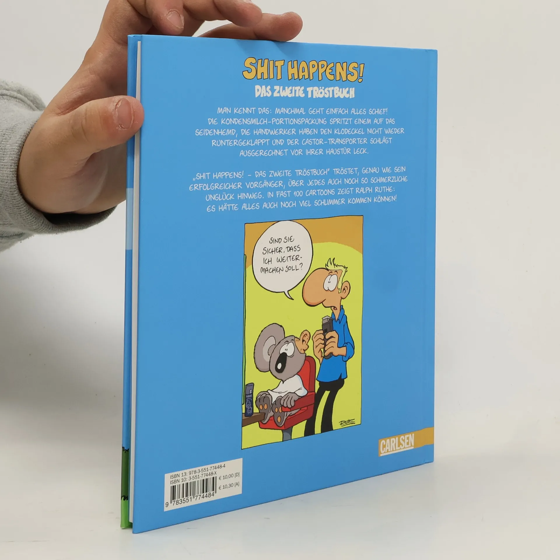 Man kennt das! Manchmal geht einfach alles schief! Die Kondensmild-Portionspackung spritzt einem auf das Seidenhemd, dieHandwerker haben den Klodeckel nicht wieder runtergeklappt und der Castor-Transporter schlägt ausgerechnet vor ihrer Haustür leck. „Shit happens! - Das zweite Tröstbuch“ tröstet, genau wie sein erfolgreicher Vorgänger, über jedes auch noch so schmerzliche Unglück hinweg. In fast 100 Cartoons zeigt Ralph Ruthe: Es hätte alles auch noch viel schlimmer kommen können!