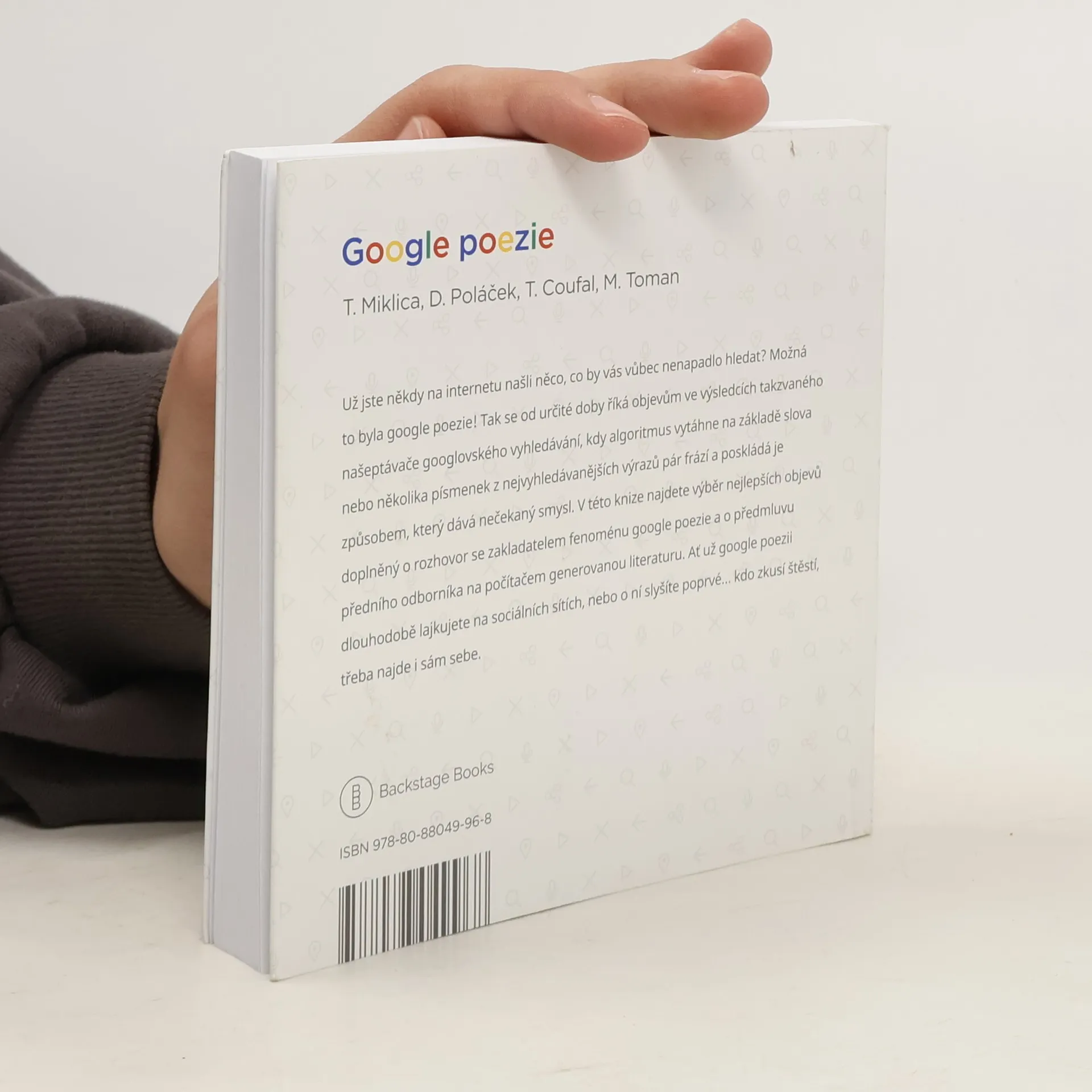Už jste někdy na internetu našli něco, co by vás vůbec nenapadlo hledat? Možná to byla google poezie! Tak se od určité doby říká objevům ve výsledcích takzvaného našeptávače googlovského vyhledávání, kdy algoritmus vytáhne na základě slova nebo několika písmenek z nejvyhledávanějších výrazů pár frází a poskládá je způsobem, který dává nečekaný smysl. V této knize najdete výběr nejlepších objevů doplněný o rozhovor se zakladatelem fenoménu google poezie a o předmluvu předního odborníka na počítačem generovanou literaturu. Ať už google poezii dlouhodobě lajkujete na sociálních sítích, nebo o ní slyšíte poprvé... kdo zkusí štěstí, třeba najde i sám sebe.