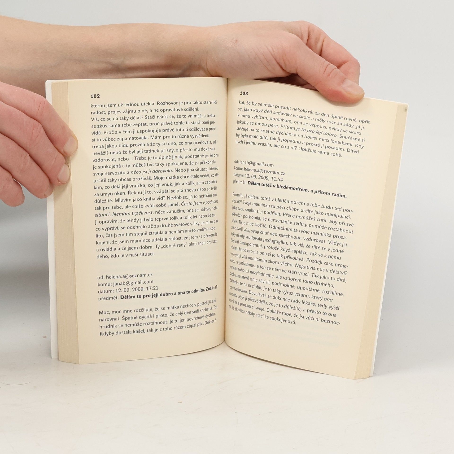 Obyvatelstvo stárne, silné populační ročníky odcházejí do penze, zatímco jejich rodiče stále žijí. Předpokládá se, že péči o stárnoucí rodiče převezmou dcery, což je vnímáno jako samozřejmost. Tyto ženy často postrádají potřebné znalosti a čelí psychickému tlaku. Jejich úsilí není oceněno, protože okolí to považuje za jejich povinnost, a obávají se, že by mohly být odsouzeny, pokud si stěžují na své obtíže. Kniha formou dopisů mezi dvěma ženami ve věku 60-65 let odhaluje traumata, s nimiž se bojí svěřit. Po odchodu do penze očekávají, že se budou věnovat svým zájmům a rodině, místo toho se však ocitají v roli pečovatelek svých matek. Nejprve se nechtějí přiznat k potížím a idealizují péči o matky. Postupně si v e-mailech sdělují každodenní problémy a frustrace. Obě ženy vyjadřují vztek na své nemocné matky a cítí se svázané péčí, což je vede k pocitům viny. Texty jsou obohaceny o odborné rady, citáty a informace o poradnách pro pečovatele, které zdůrazňují, že přiznat si potřebu odpočinku a uznání je normální. Kniha také zkoumá vztah matka-dcera z různých perspektiv, včetně etických otázek týkajících se umístění rodičů do sociálních ústavů.