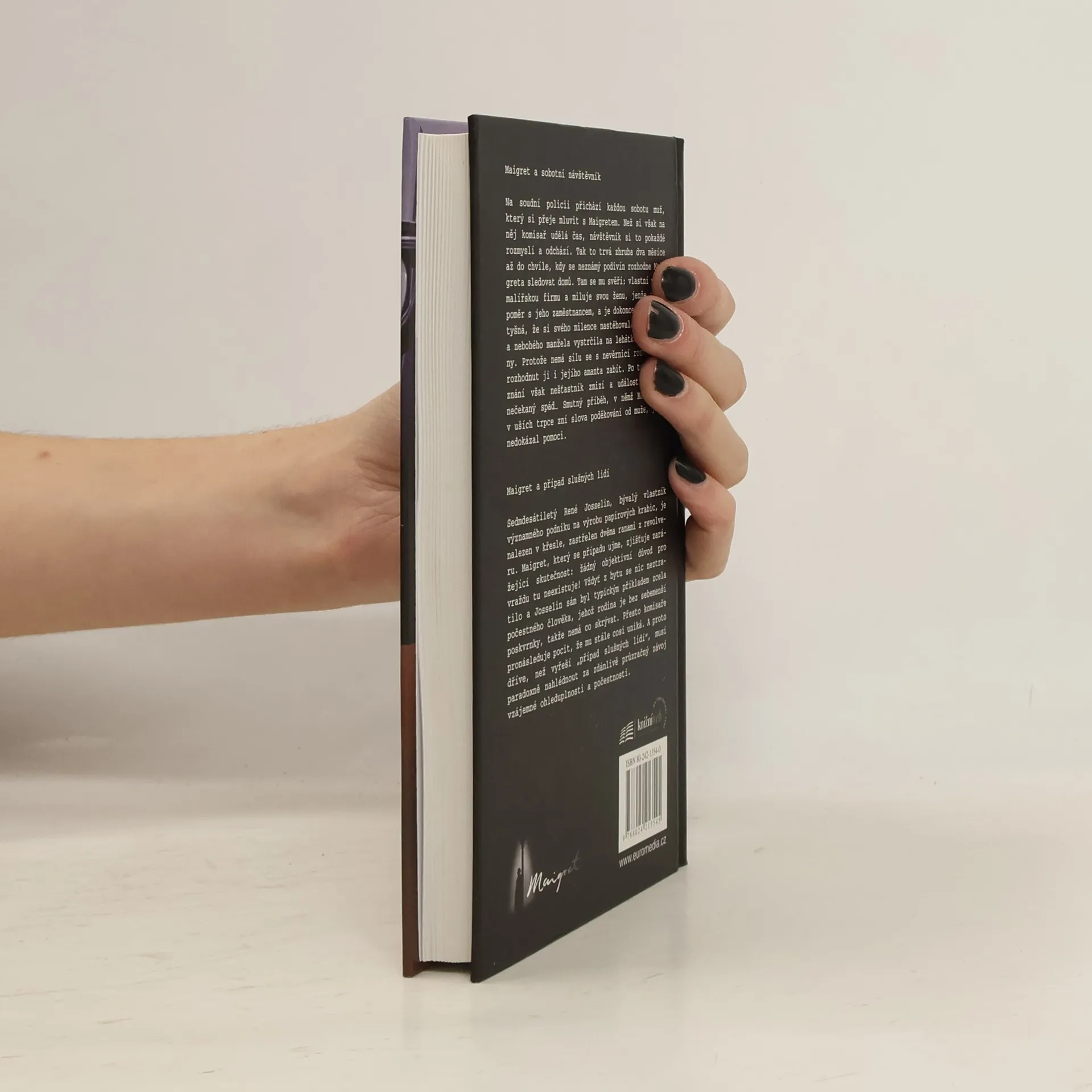 Maigret a sobotní návštěvník – Na soudní policii přichází každou sobotu muž, který si přeje mluvit s Maigretem. Než si však na něj komisař udělá čas, návštěvník si to pokaždé rozmyslí a odchází. Tak to trvá zhruba dva měsíce až do chvíle, kdy se neznámý podivín rozhodne Maigreta sledovat domů. Tam se mu svěří: vlastní malou malířskou firmu a miluje svou ženu, jenže ta má poměr s jeho zaměstnancem, a je dokonce tak bezostyšná, že si svého milence nastěhovala do ložnice a nebohého manžela vystrčila na lehátko do jídelny. Protože nemá sílu se s nevěrnicí rozvést, je rozhodnut ji i jejího amanta zabít. Po tomto přiznání však nešťastník zmizí a události naberou nečekaný spád… Smutný příběh, v němž Maigretovi v uších trpce zní slova poděkování od muže, jemuž nedokázal pomoci. Maigret a případ slušných lidí – Sedmdesátiletý René Josselin, bývalý vlastník významného podniku na výrobu papírových krabic, je nalezen v křesle, zastřelen dvěma ranami z revolveru. Maigret, který se případu ujme, zjišťuje zarážející skutečnost: žádný objektivní důvod pro vraždu tu neexistuje! Vždyť z bytu se nic neztratilo a Josselin sám byl typickým příkladem zcela počestného člověka, jehož rodina je bez sebemenší poskvrnky, takže nemá co skrývat. Přesto komisaře pronásleduje pocit, že mu stále cosi uniká. A proto dříve, než vyřeší „případ slušných lidí“, musí paradoxně nahlédnout za zdánlivě průzračný závoj vzájemné ohleduplnosti a počestnosti.
