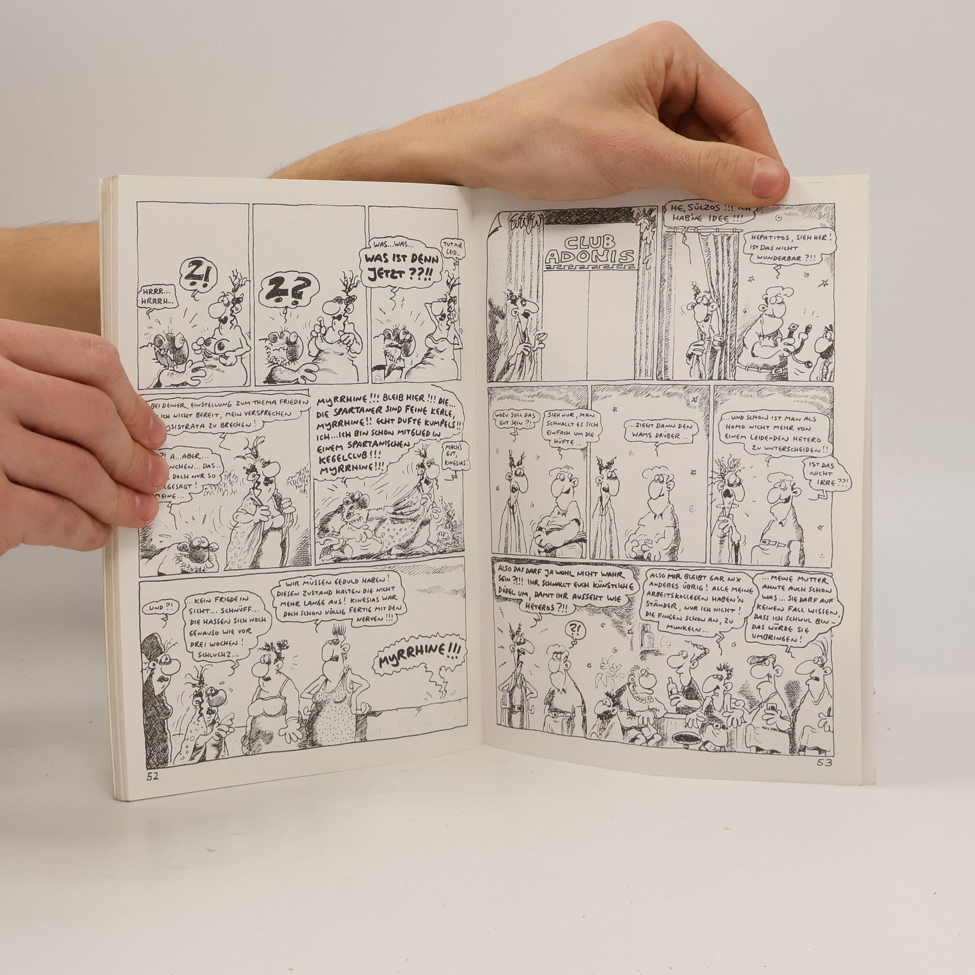 Männliches Kriegsgetöse vor den Mauern Athens, doch das Weibsvolk wird aufmüpfig: Ehebetten-Sexboykott, bis endlich Frieden einkehrt! Kampflesbe Lysistrata setzt auf weibliche Schönheit und Raffinesse, und tatsächlich grunzen die wilden Krieger nach kurzer Zeit notgeil und kampfunfähig über die Agora. Aristophanes’ frivole Komödie hatte 411 vor Christus Premiere, aber wie konnte der alte Grieche in seinem Spiel die nicht minder schönen und raffinierten Schwulen vergessen? Ralf König holt das Versäumnis nach: klassisch, derb, testosteronbesoffen. Vorhang auf! Gröl!