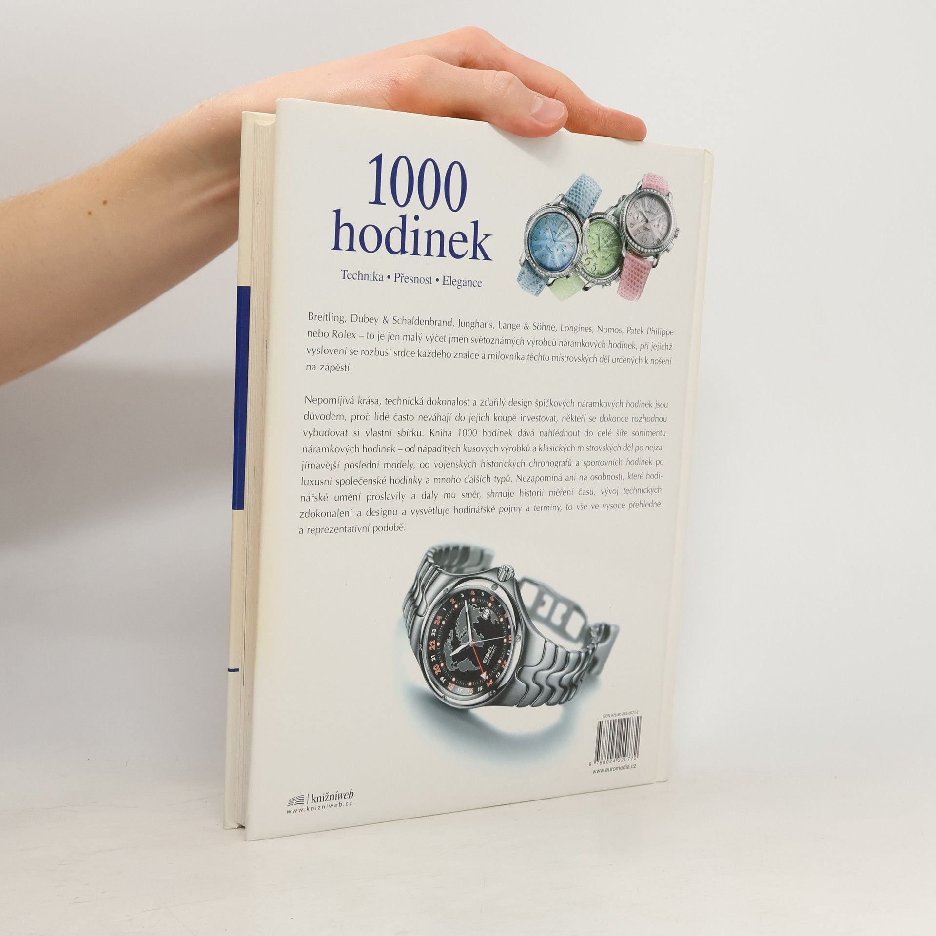 1000 hodinek Technika o Přesnost o Elegance Nepomíjivá krása ušlechtilých časoměrů představuje pro každého neodolatelné kouzlo. Hodinky jsou šperkem, ale zároveň i neodmyslitelným společníkem pro všední den. Nezřídka jsou také stylovou záležitostí a symbolem společenského postavení. V krátkých výstižných textech kniha představuje známé značky a na krásných fotografiích zobrazuje reprezentativní modely. Není určena jen profesionálním sběratelům, a proto nezůstává u pouhého popisu, ale přibližuje i nejdůležitější pojmy ze světa hodinek: čtenář se dozví, co je například rezerva chodu, měsíční fáze nebo tourbillon. Nalezne v ní také informace o historii a úspěšných výsledcích hodinářského umění. Kniha nabízí nevídaný přehled světové produkce hodin -- záměrně bez uvádění cenových relací. Komplexnost nebo cenové porovnávání nebylo jejím cílem. Kdo byli a jsou hodináři, kteří včera i dnes činí čas měřitelným a snoubí ve výrobcích dokonalého vzhledu přesnou techniku a ušlechtilé materiály? Mnohým hodinářským manufakturám vděčíme nejen za technické vymoženosti vedoucí k pokroku i v jiných oborech lidské činnosti, ale často ovlivnily historický vývoj celých hospodářských oblastí. Nechte se zavést do fascinujícího světa náramkových hodinek!