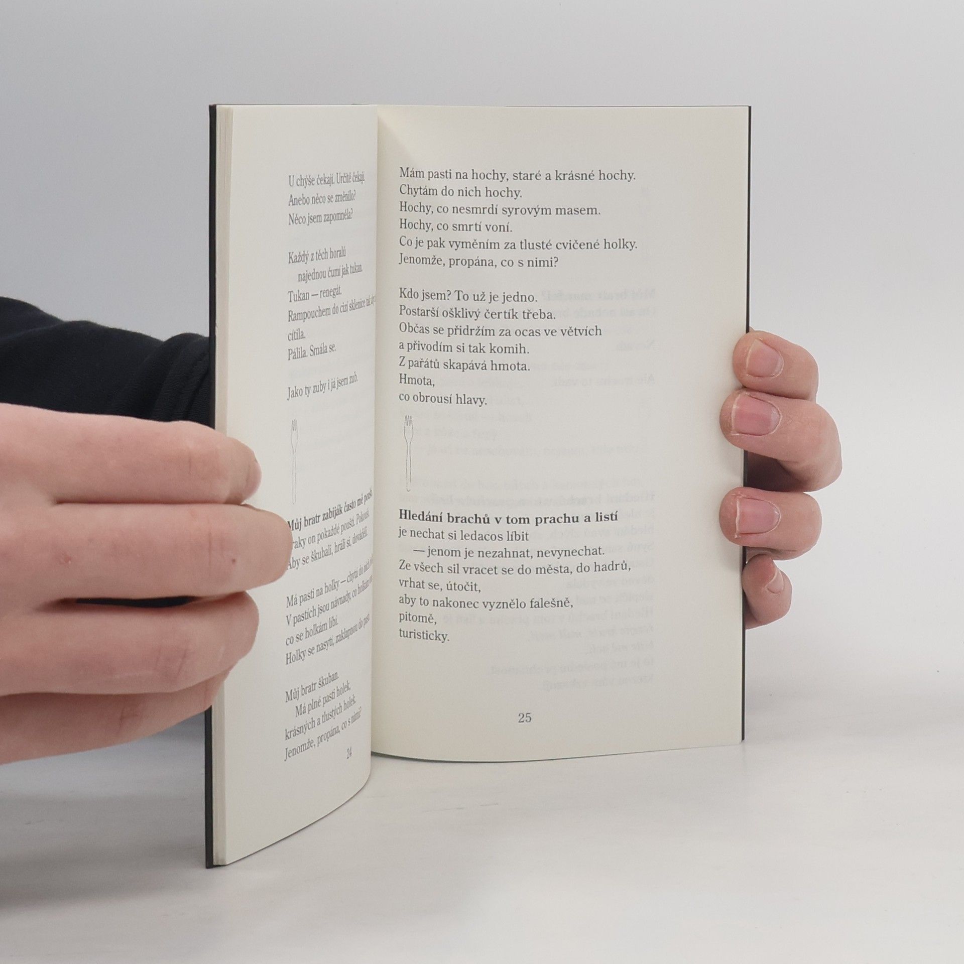 Autorčina třetí kniha obsahuje básnickou skladbu, v níž zaujme především silná expresivita. Tento příběh-nepříběh formálně navazuje na autorčinu oceněnou skladbu "Výmluva" (Ortenova cena 1996). V básni samotné má totiž dojít k určité události (v tomto případě k večeři), ale nikdy k ní nedochází. Pro autorku je už charakteristické, že se neustále vrací k jednotlivě rozehraným motivům, které jsou navíc podtrženy řadou asociací. Výsledkem pak zde je dojem celistvosti, neboť každá představa či náznak akce je zde funkční a má svůj řád.