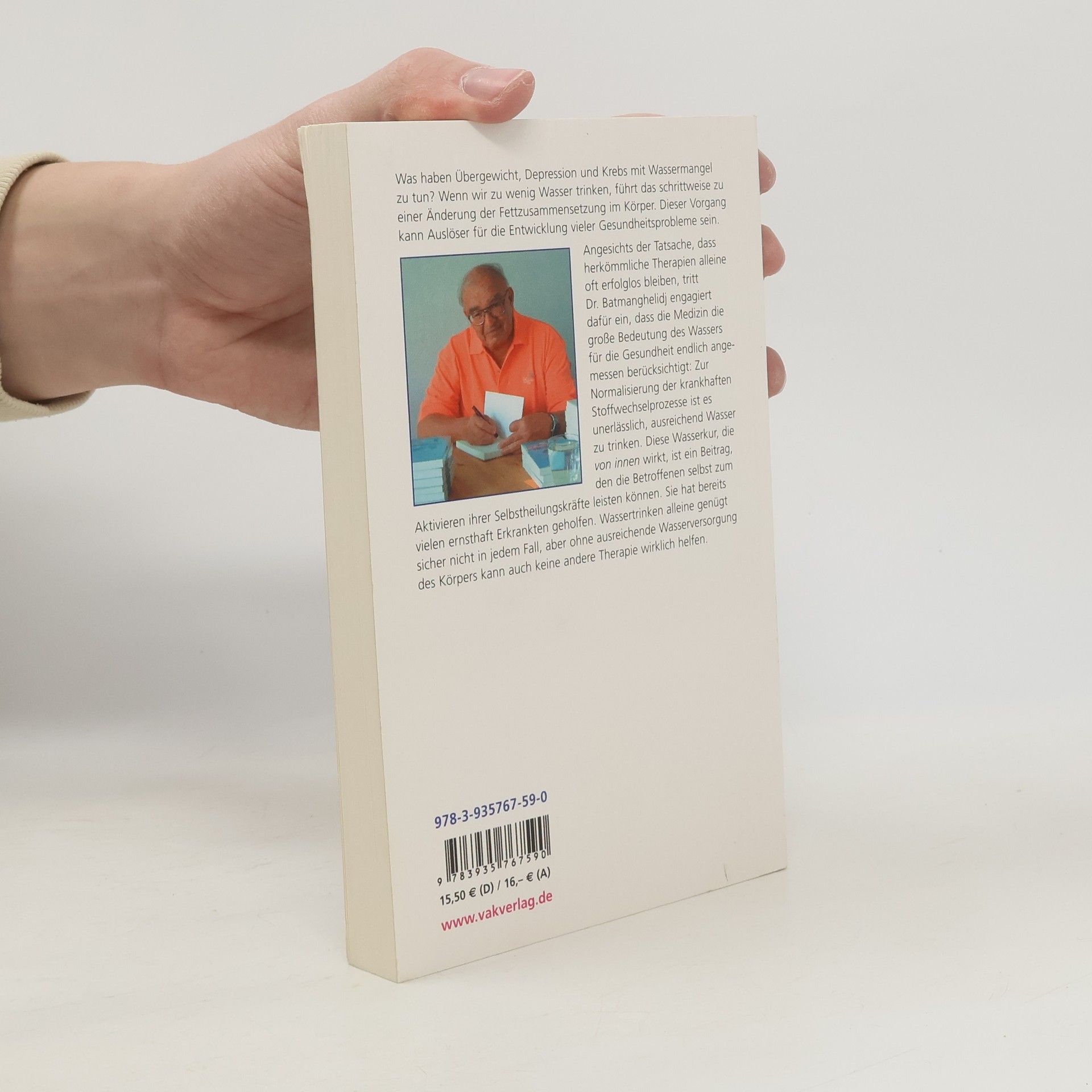 Was haben Übergewicht, Depression und Krebs mit Wassermangel zu tun? Wenn wir zu wenig Wasser trinken, führt das schrittweise zu einer Änderung der Fettzusammensetzung im Körper. Dieser Vorgang kann Auslöser für die Entwicklung vieler Gesundheitsprobleme sein. Angesichts der Tatsache, dass herkömmliche Therapien alleine oft erfolglos bleiben, tritt Dr. Batmanghelidj engagiert dafür ein, dass die Medizin die große Bedeutung des Wassers für die Gesundheit endlich angemessen berücksichtigt: Zur Normalisierung der krankhaften Stoffwechselprozesse ist es unerlässlich, ausreichend Wasser zu trinken. Diese Wasserkur, die von innen wirkt, ist ein Beitrag, den die Betroffenen selbst zum Aktivieren ihrer Selbstheilungskräfte leisten können. Sie hat bereits vielen ernsthaft Erkrankten geholfen. Wassertrinken alleine genügt sicher nicht in jedem Fall, aber ohne ausreichende Wasserversorgung des Körpers kann auch keine andere Therapie wirklich helfen.