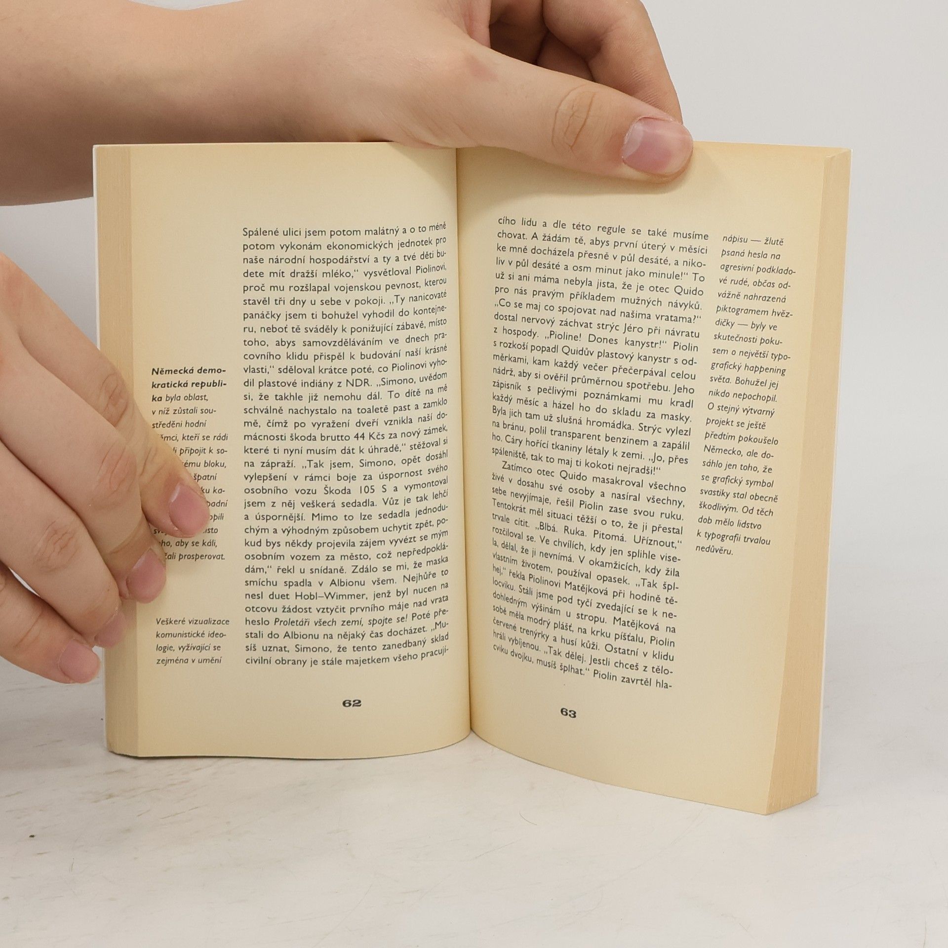 Chrómované nárazníky, transparenty a hesla. Anticharta, moskviče, nepoživatelné kubánské pomeranče. Zatímco v Anglii řvou punkeři o bídě světa, v Československu zpívají umělci na lopatkách trapné songy o míru. A tam někde v oparu sedmdesátých let jsem zahlédl klátivou postavu dvouhlavého žáka Piolina. V časech, které teprve přijdou, se stane prvním a posledním prezidentem sjednoceně rozvrácené Evropy. Toto je příběh jeho (a mého) dětství žitého tenkrát za JUDr. Husáka.