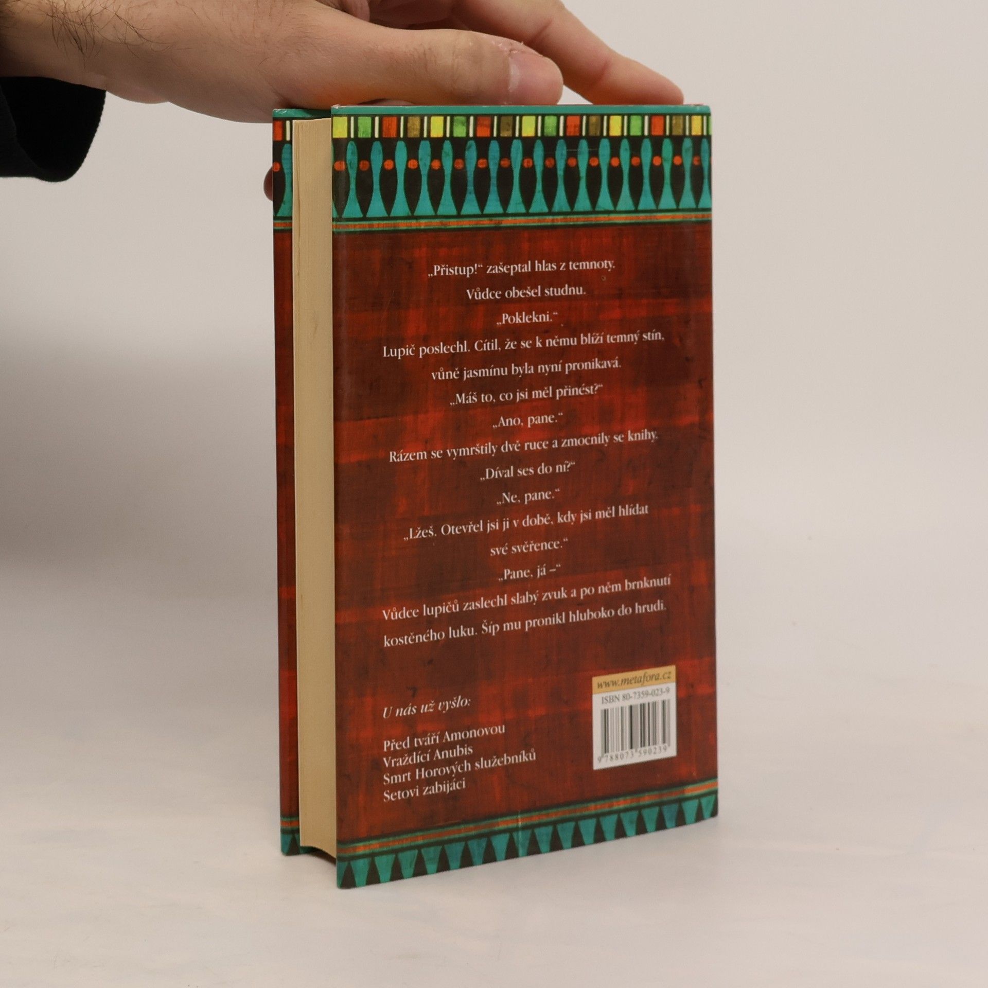 Už popáté nás skvělý vypravěč zve na cestu do starověkého Egypta, ke dvoru královny Hatšepsut zvané Hatusu, jíž věrně slouží její statečný a moudrý soudce Amerotke. Hned na začátku se ocitneme v Údolí králů, mezi vykradači hrobek. Brzy nato je ve své vlastní posteli nalezen mrtev generál egyptské armády, kolem jehož těla se hemží smrtelně jedovaté rohaté zmije. Amerotke a jeho nerozlučný pomocník, beznosý trpaslík Šufoj, se pouštějí do pátrání. Případ se ale komplikuje a kromě generálovy smrti je náhle třeba vyšetřit ještě zmizení čtyř dívek z Isidina chrámu a příšernou vraždu kapitána chrámové stráže. Královna-faraon navíc trvá na tom, že předně musejí být dopadeni a usvědčeni lupiči bezostyšně plenící bohaté hrobky. Do toho se kromě živých začnou záhadně ztrácet i mrtví a všechno neúprosně spěje k ohromujícímu odhalení…