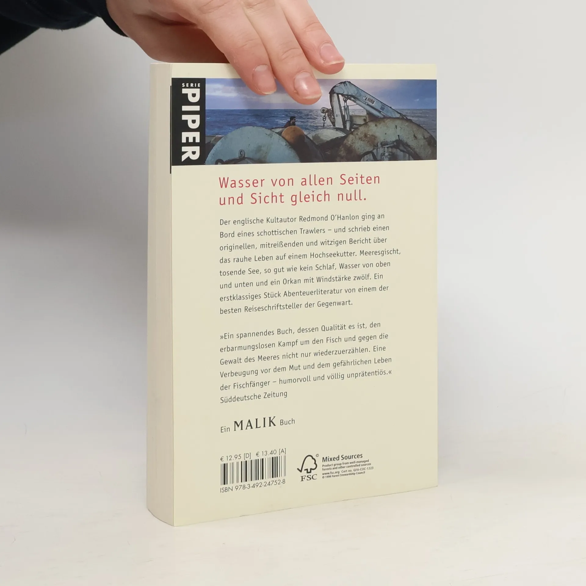 Der englische Kultautor Redmond O Hanlon ging an Bord eines schottischen Trawlers und schrieb einen originellen, mitreißenden und witzigen Bericht über das rauhe Leben auf einem Hochseekutter. Meeresgischt, tosende See, so gut wie kein Schlaf, Wasser von oben und unten und ein Orkan mit Windstärke zwölf. Ein erstklassiges Stück Abenteuerliteratur von einem der besten Reiseschriftsteller der Gegenwart.»Ein spannendes Buch, dessen Qualität es ist, den erbarmungslosen Kampf um den Fisch und gegen die Gewalt des Meeres nicht nur wiederzuerzählen. Eine Verbeugung vor dem Mut und dem gefährlichen Leben der Fischfänger humorvoll und völlig unprätentiös.«Süddeutsche Zeitung