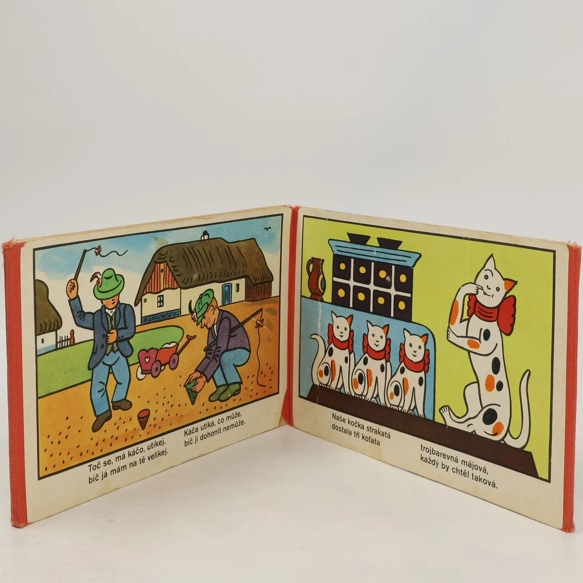 Klasické leporelo, které poprvé vyšlo před sedmdesáti lety (1941)! V nakladatelství Albatros nově a poprvé v roce 1968; později v pozměněném vydání pod názvem Utíkej, Káčo, utíkej! Veselé leporelo Josefa Lady s lidovými říkadly o koťatech, zajíčkovi, vodníkovi, zimě, houbách... je dnes českou klasikou i nakladatelským evergreenem.