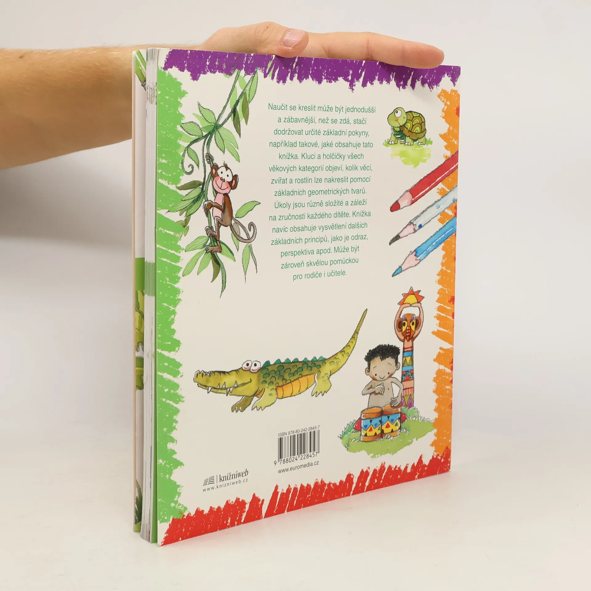 Nauč se kreslit 2. Nauč se kreslit krok za krokem zvířata a postavy z džungle. Nauč se kreslit džungli navazuje na úspěšnou knihu od stejné autorky Nauč se kreslit. Opět se zde děti učí kreslit pomocí jednoduchých tvarů, tentokrát především zvířata, o kterých se zároveň dozvídají různé zajímavosti. Stejně jako předchozí kniha i tato seznamuje s některými základními principy, například s perspektivou, a může proto sloužit jako skvělá pomůcka rodičům i učitelům.
