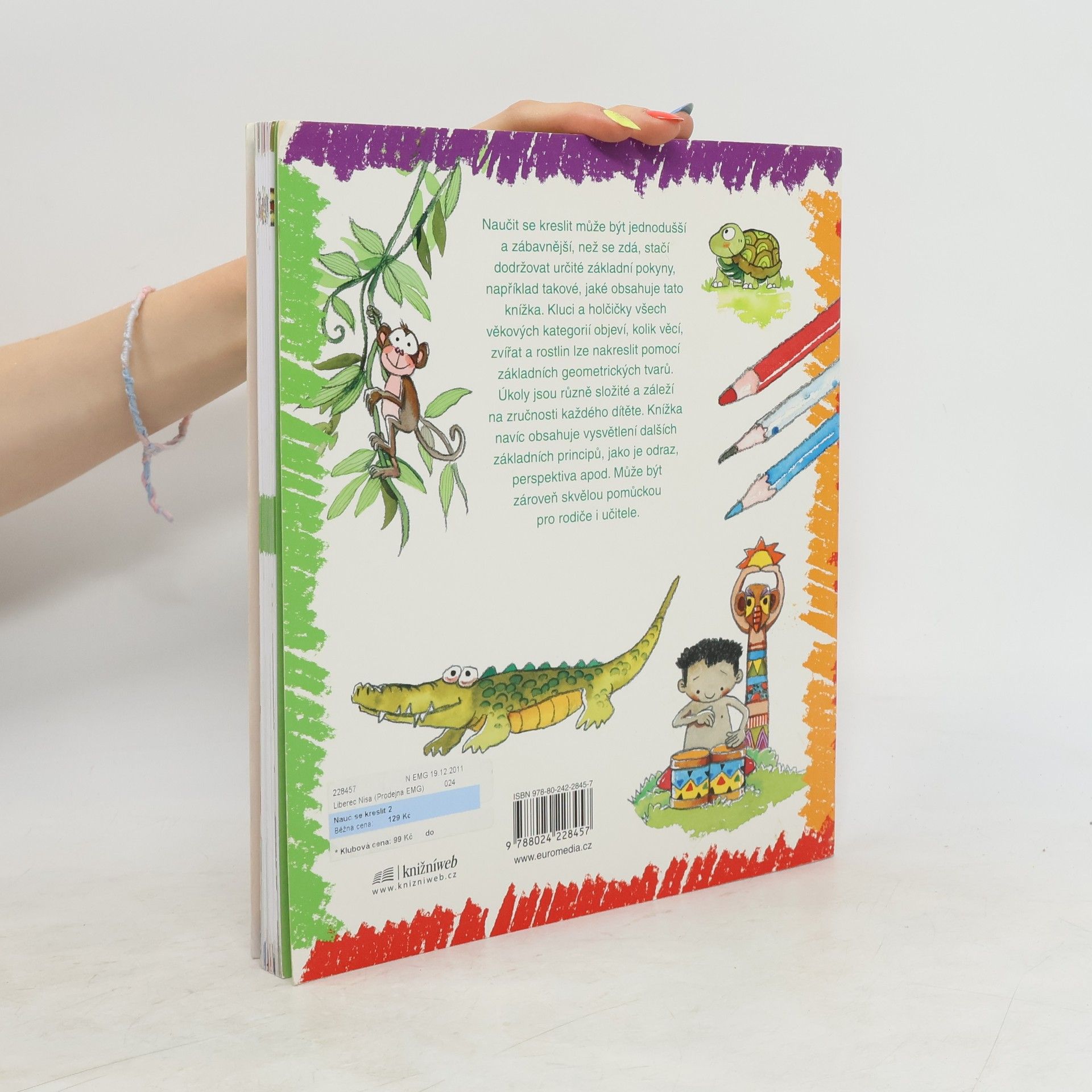 Nauč se kreslit 2. Nauč se kreslit krok za krokem zvířata a postavy z džungle. Nauč se kreslit džungli navazuje na úspěšnou knihu od stejné autorky Nauč se kreslit. Opět se zde děti učí kreslit pomocí jednoduchých tvarů, tentokrát především zvířata, o kterých se zároveň dozvídají různé zajímavosti. Stejně jako předchozí kniha i tato seznamuje s některými základními principy, například s perspektivou, a může proto sloužit jako skvělá pomůcka rodičům i učitelům.