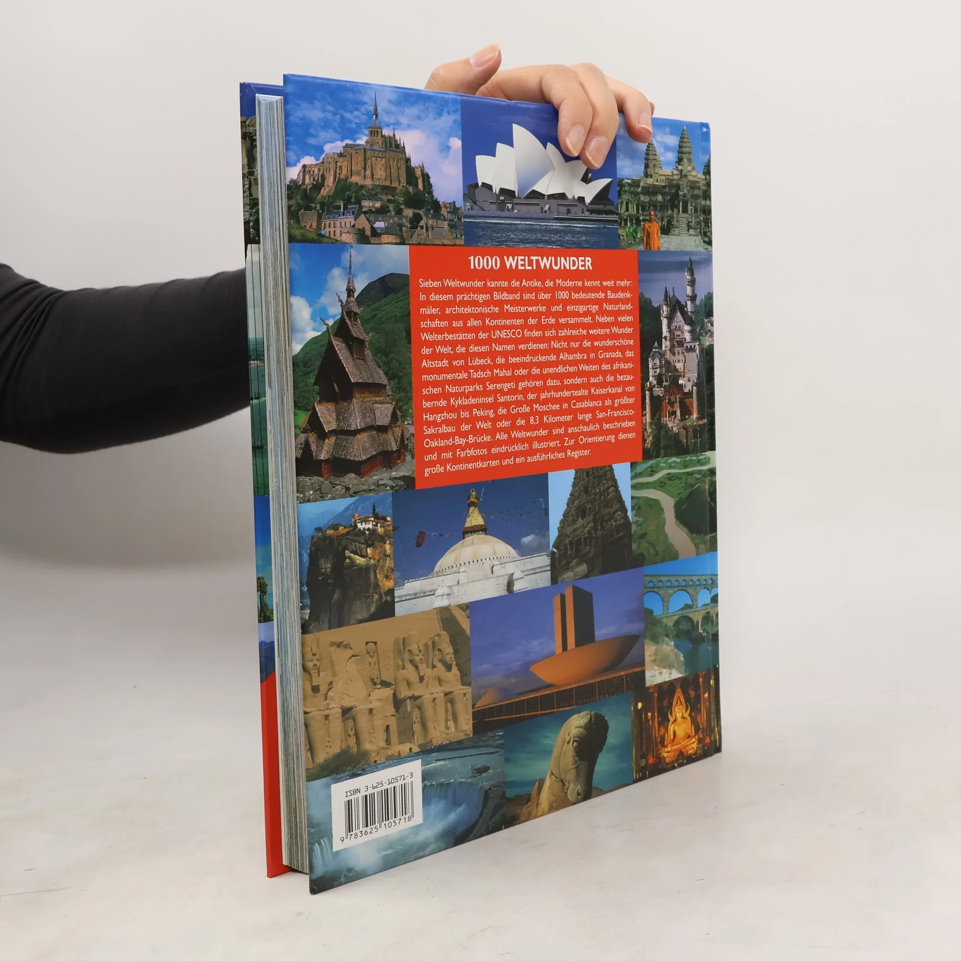 Sieben Weltwunder kannte die Antike, die Moderne kennt weit mehr: In diesem prächtigen Bildband sind über 1000 bedeutende Baudenkmäler, architektonische Meisterwerke und einzigartige Naturlandschaften aus allen Kontinenten der Erde versammelt. Neben vielen Welterbestätten der UNESCO finden sich zahlreiche weitere Wunder der Welt, die diesen Namen verdienen: Nicht nur die wunderschöne Altstadt von Lübeck, die beeindruckende Alhambra in Granada, das monumentale Tadsch Mahal oder die unendlichen Weiten des afrikanischen Naturparks Serengeti gehören dazu, sondern auch die bezaubernde Kykladeninsel Santorin, der jahrhundertealte Kaiserkanal von Hangzhou bis Peking, die Große Moschee in Casablanca als größter Sakralbau der Welt oder die 8,3 Kilometer lange San-Francisco-Oakland-Bay-Brücke. Alle Weltwunder sind anschaulich beschrieben und mit Farbfotos eindrücklich illustriert. Zur Orientierung dienen große Kontinentalkarten und ein ausführliches Register.