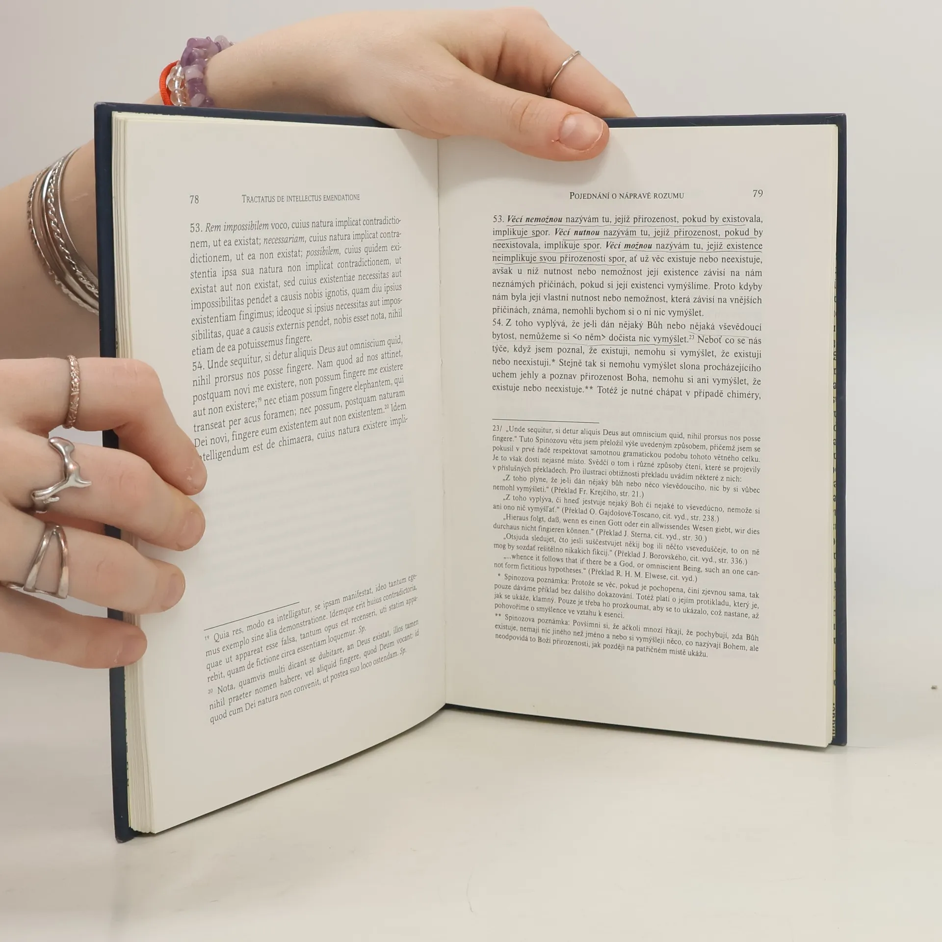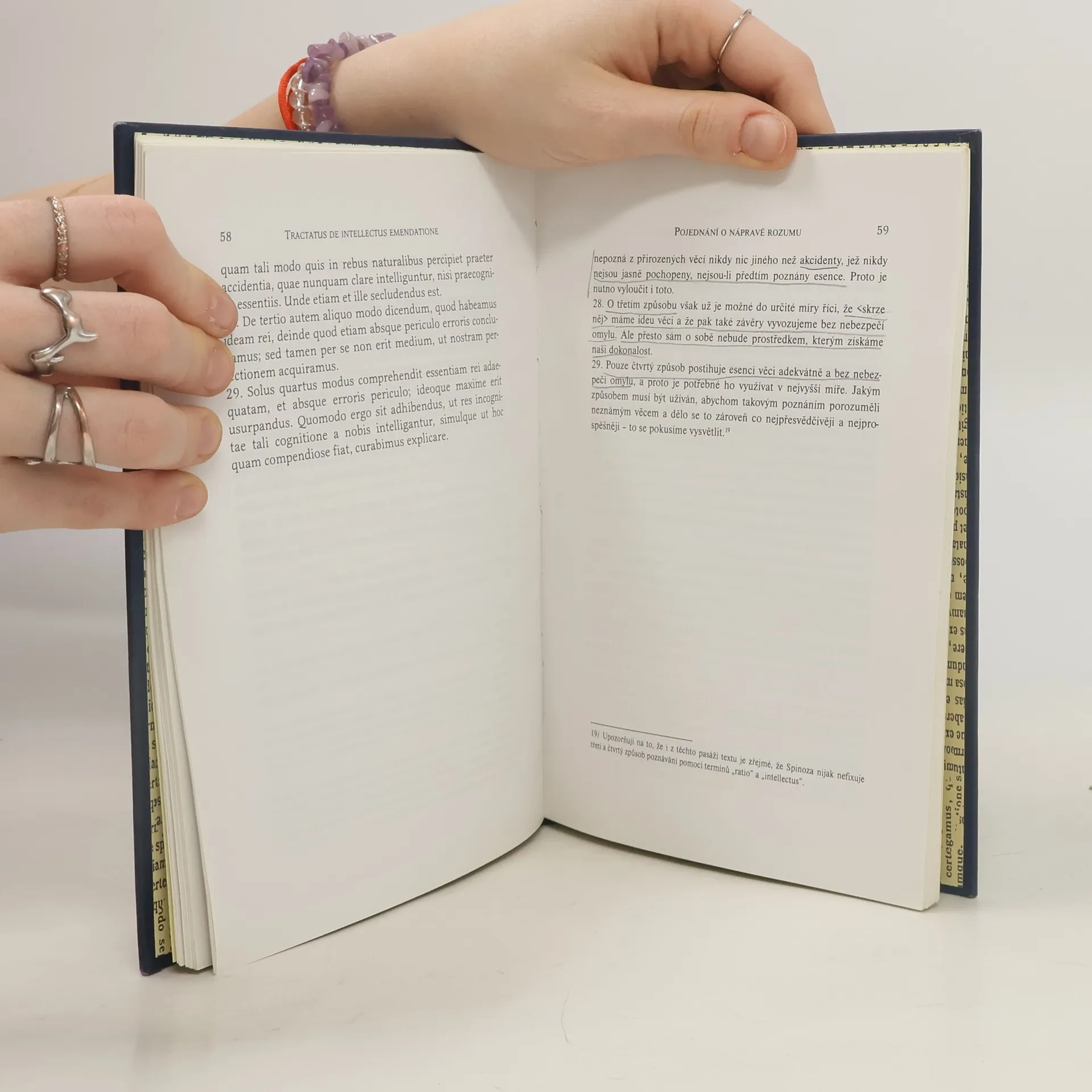 Pojednání o nápravě rozumu a o cestě, kterou je veden přímo k pravému poznání věcí : bilingva Význačný filozof vymezuje základní principy, které slouží pravému poznání věcí. Východisko a hlavní opěrný bod veškerého pravdivého poznání ztělesňuje motiv pravdivé ideje. Holandský filozof židovského původu naznačuje základní rozdíly, jež odlišují pravdivé od ostatních idejí a na tomto základě kritizuje směšování pravdivých idejí s klamnými, smyšlenými či pochybnými. Ve druhé části spisu vymezuje pravidla, která umožňují ze známého správně vyvozovat neznámé. Existují však dva způsoby poznávání: poznávání skrze samotnou esenci nebo poznávání skrze nejbližší příčinu. Oba způsoby pravdivého poznání mají své kořeny v pravdivé definici věcí. Kritérium rozpoznání pravdy nacházíme v ideji o nekonečně dokonalé bytosti...