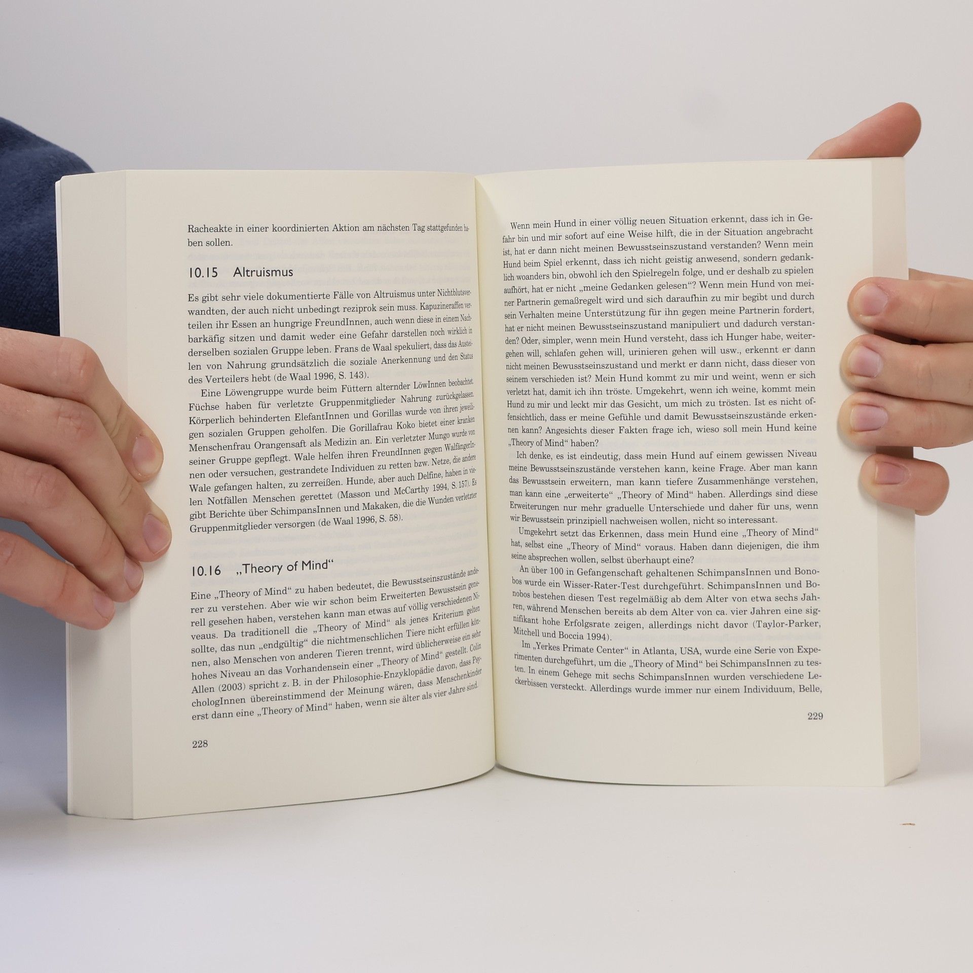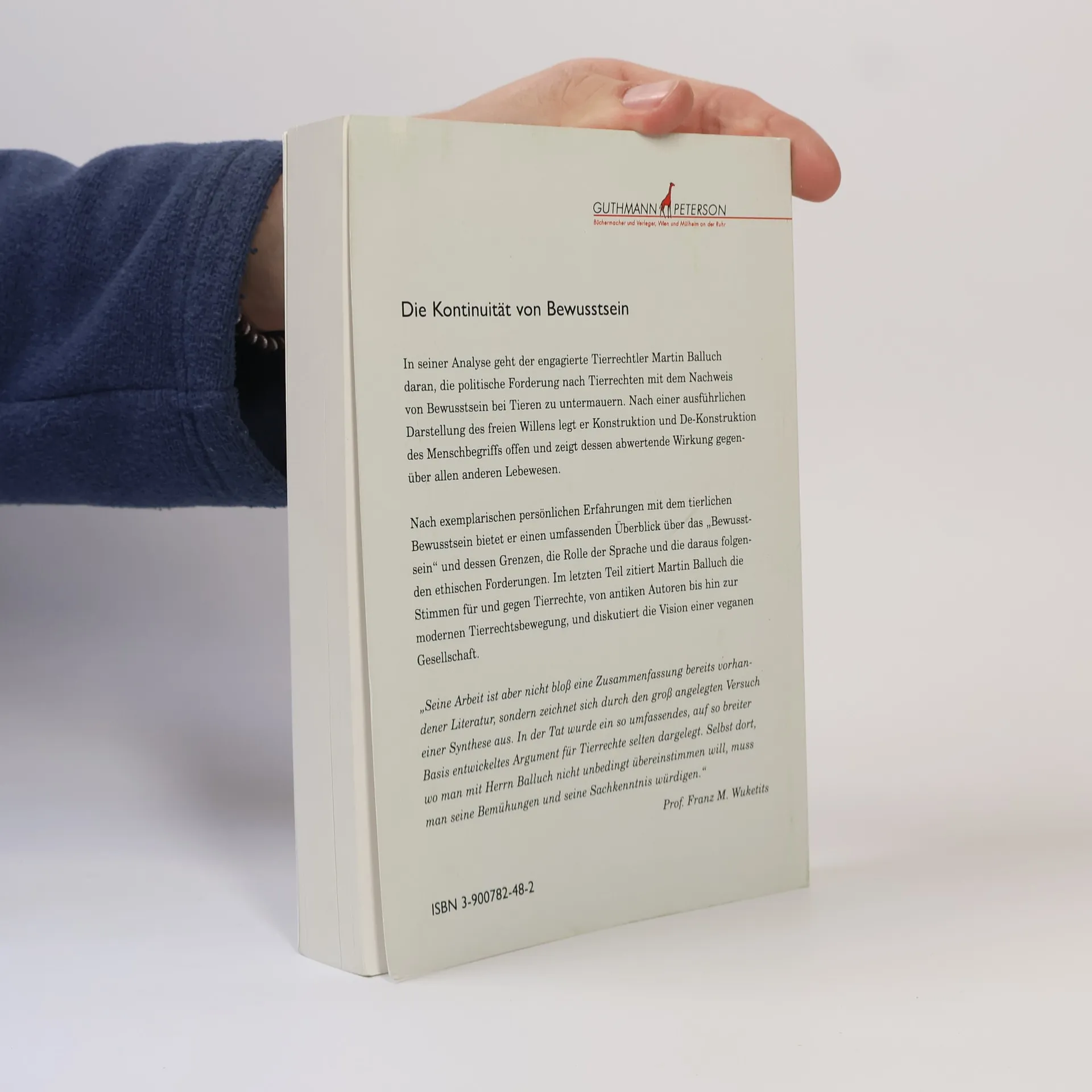 In seiner philosophischen Dissertation unternimmt Martin Balluch den Versuch, die politische Forderungen nach Tierschutz und Tierrecht über den Nachweis des Bewusstseins bei Tieren und des freien Willens beim Menschen abzuleiten. Nach einer ausführlichen Darstellung des freien Willens, durchaus auch im naturwissenschaftlichen Sinn, zeigt der Autor die Konstruktion und De-Konstruktion des Menschbegriffs in seiner abwertenden Abgrenzung gegenüber allen nichtmenschlichen Lebewesen. Nach exemplarischen, persönlichen Erfahrungen mit tierlichem Bewusstsein gibt er einen umfassenden Überblick über theoretische und praktische Untersuchungen und Erfahrungen mit Bewusstsein, seinen Anzeichen und Äußerungen. Besonderer Augenmerk gilt dabei der Rolle der Sprache und der Frage, ob sie für das Bewusstsein relevant ist, den Grenzen des Bewusstseins und den seiner Meinung nach zwingend folgenden ethischen Forderungen. Im letzten Teil schließt der Autor den Bogen von den frühen Tierrechtsideen bis hin zur modernen Tierrechtsbewegung und diskutiert die Utopie einer veganen Gesellschaft. Das Bemerkenswerte an dieser Arbeit ist die Verbindung naturwissenschaftlicher Gedankengänge mit ethischen Forderungen, die Martin Balluch, der „in seinem ersten Leben" Physiker war, vollzieht, und die Konsequenz, mit der der engagierte, aktive Tierrechtler seine Argumentation vorträgt.