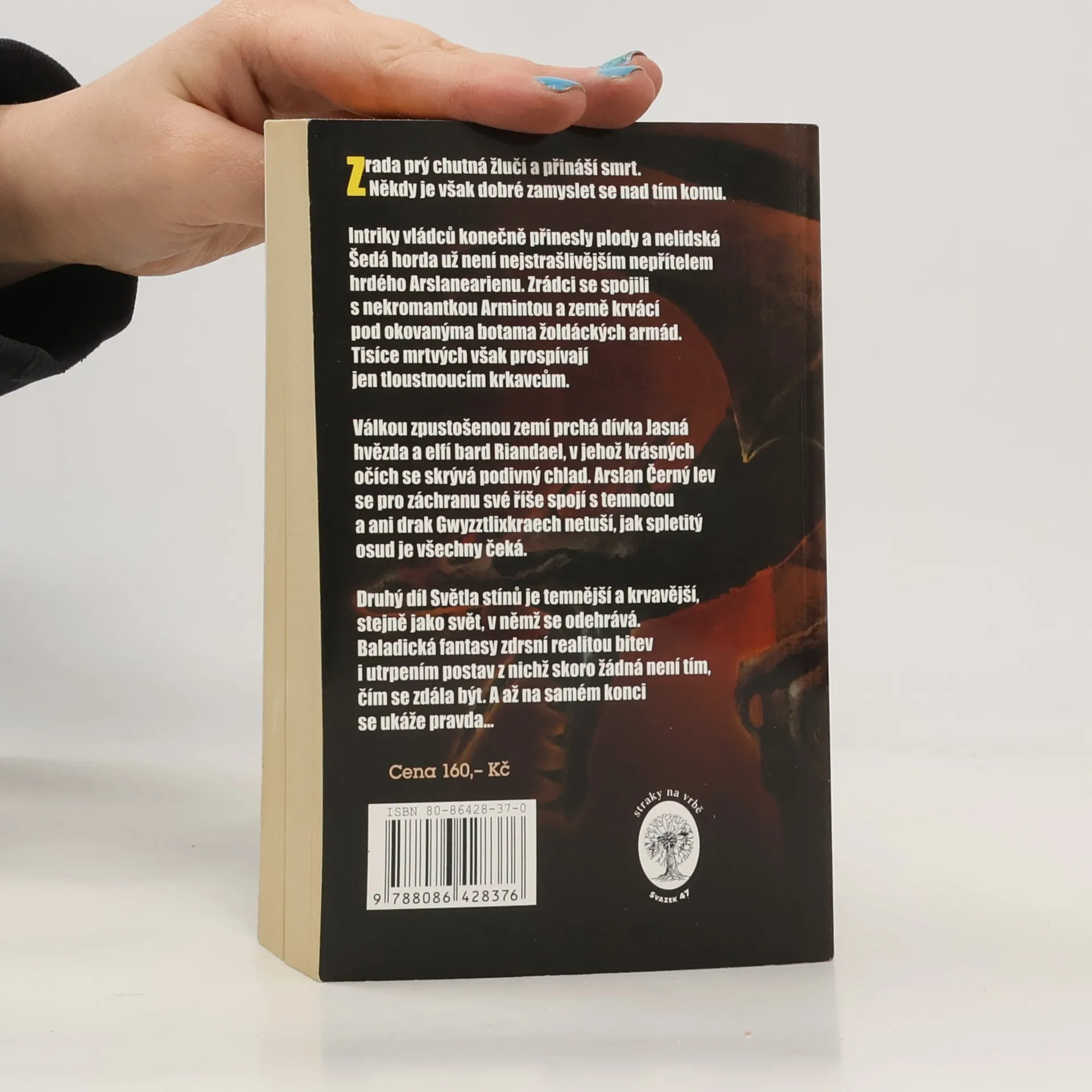Zrada prý chutná žlučí a přináší smrt. Někdy je však dobré zamyslet se nad tím komu. Intriky vládců konečně přinesly plody a nelidská Šedá horda už není nejstrašlivějším nepřítelem hrdého Arslanearienu. Zrádci se spojili s nekromantkou Armintou a země krvácí pod okovanýma botama žoldáckých armád. Tisíce mrtvých však prospívají jen tloustnoucím krkavcům. Válkou zpustošenou zemí prchá dívka Jasná hvězda a elfí bard Riandael, v jehož krásných očích se skrývá podivný chlad. Arslan Černý lev se pro záchranu své říše spojí s temnotou a ani drak Gwyzztlixkraech netuší, jak spletitý osud je všechny čeká. Druhý díl Světla stínů je temnější a krvavější, stejně jako svět, v němž se odehrává. Baladická fantasy zdrsní realitou bitev i utrpením postav z nichž skoro žádná není tím, čím se zdála být. A až na samém konci se ukáže pravda…