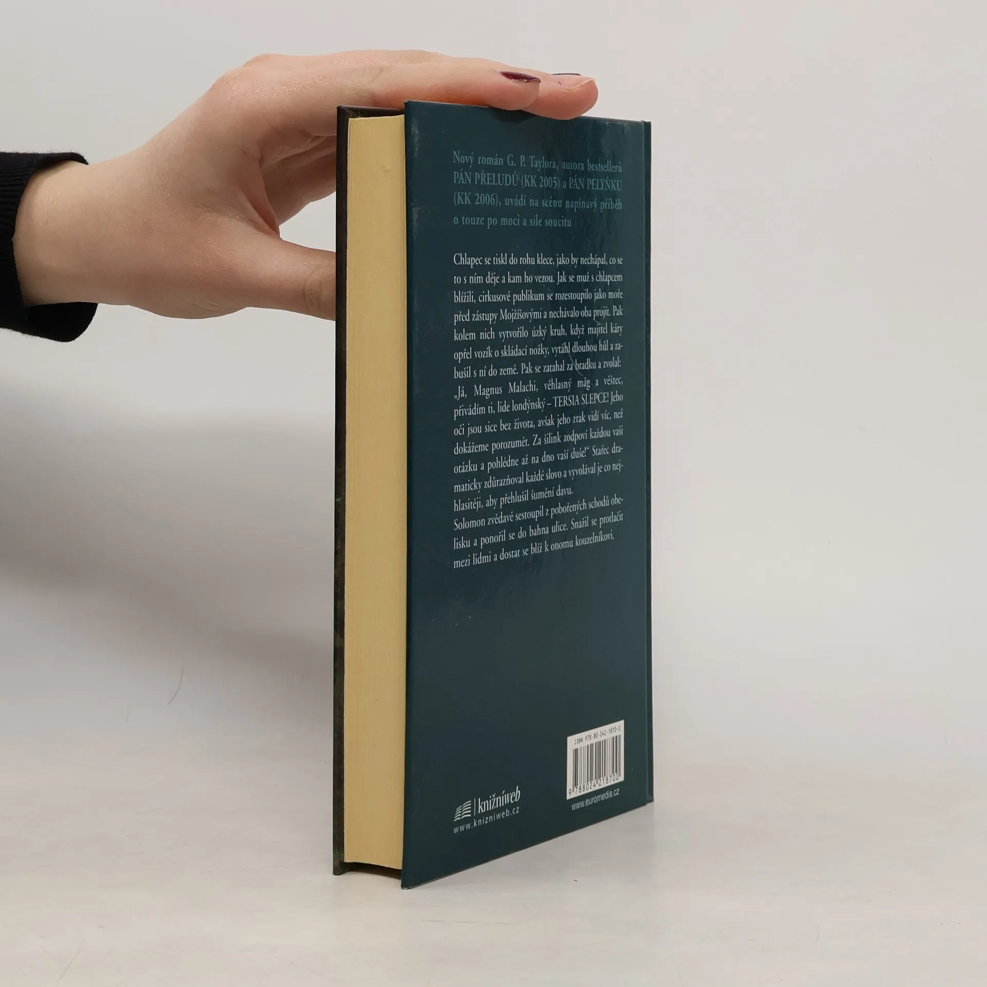 Nový román G. P. Taylora, autora bestsellerů PÁN PŘELUDŮ (KK 2005) a PÁN PELYŇKU (KK 2006), uvádí na scénu napínavý příběh o touze po moci a síle soucitu. Chlapec se tiskl do rohu klece, jako by nechápal, co se to s ním děje a kam ho vezou. Jak se muž s chlapcem blížili, cirkusové publikum se rozestoupilo jako moře před zástupy Mojžíšovými a nechávalo oba projít. Pak kolem nich vytvořilo úzký kruh, když majitel káry opřel vozík o skládací nožky, vytáhl dlouhou hůl a zabušil s ní do země. Pak se zatahal za bradku a zvolal: „Já, Magnus Malachi, věhlasný mág a věštec, přivádím ti, lide londýnský – TERSIA SLEPCE! Jeho oči jsou sice bez života, avšak jeho zrak vidí víc, než dokážeme porozumět. Za šilink zodpoví každou vaši otázku a pohlédne až na dno vaší duše!“ Stařec dramaticky zdůrazňoval každé slovo a vyvolával je co nejhlasitěji, aby přehlušil šumění davu. Solomon zvědavě sestoupil z pobořených schodů obelisku a ponořil se do bahna ulice. Snažil se protlačit mezi lidmi a dostat se blíž k onomu kouzelníkovi.