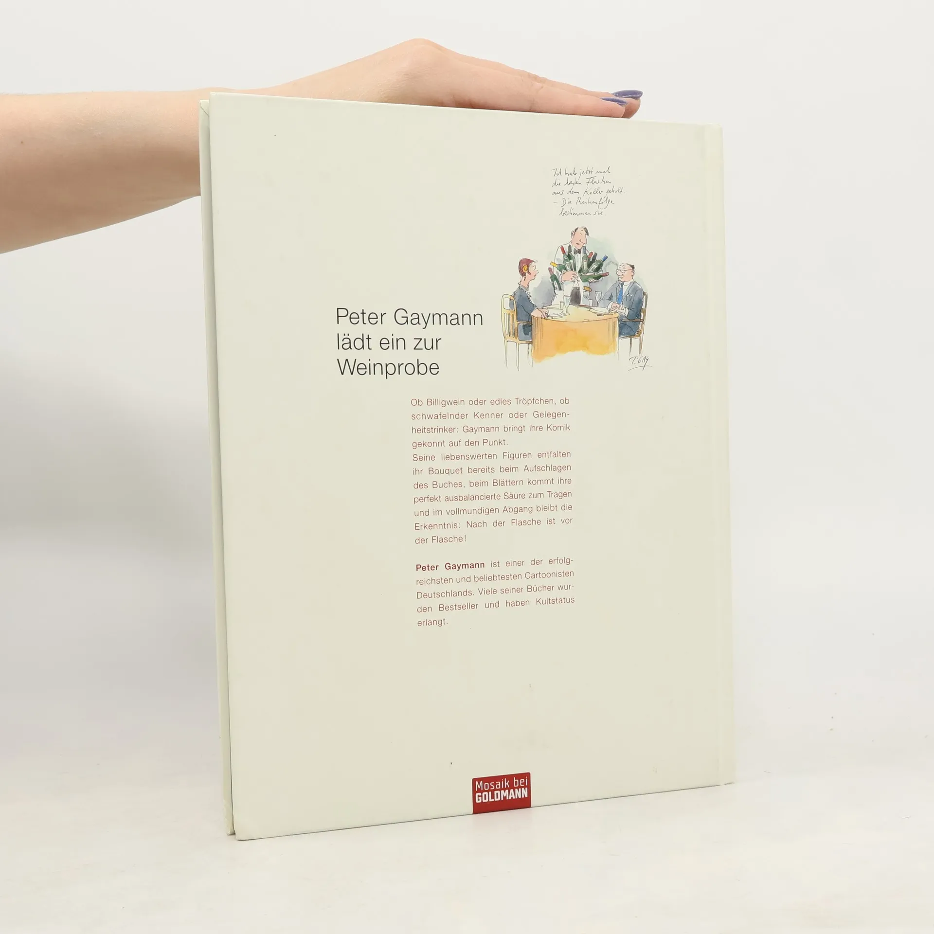 Spritzige Cartoons – In vino veritas! Der Geist aus der Flasche bringt so manche Wahrheit ans Licht und ermöglicht einen Blick auf unser wahres Wesen. Mit spitzer Feder, frechen Sprüchen und seinem unverwechselbaren Zeichenstil hat Peter Gaymann die (Un-)Sitten der Weintrinker, -kenner und –hasser in amüsante Cartoons verwandelt. Gaymann legt in seinem neuen Buch ca. 80 Zeichnungen vor, die Genießer, Verkoster und andere Menschen bei einem guten Tropfen und in allen möglichen und unmöglichen Lebenslagen zeigen. Von trocken bis spritzig – Gaymanns Humor trifft immer wieder ins Schwarze. Das ideale Geschenk für nette Zeitgenossen – statt oder zu der Flasche Wein. Ausstattung: durchgehend 4-farbig, 88 farbige Abbildungen