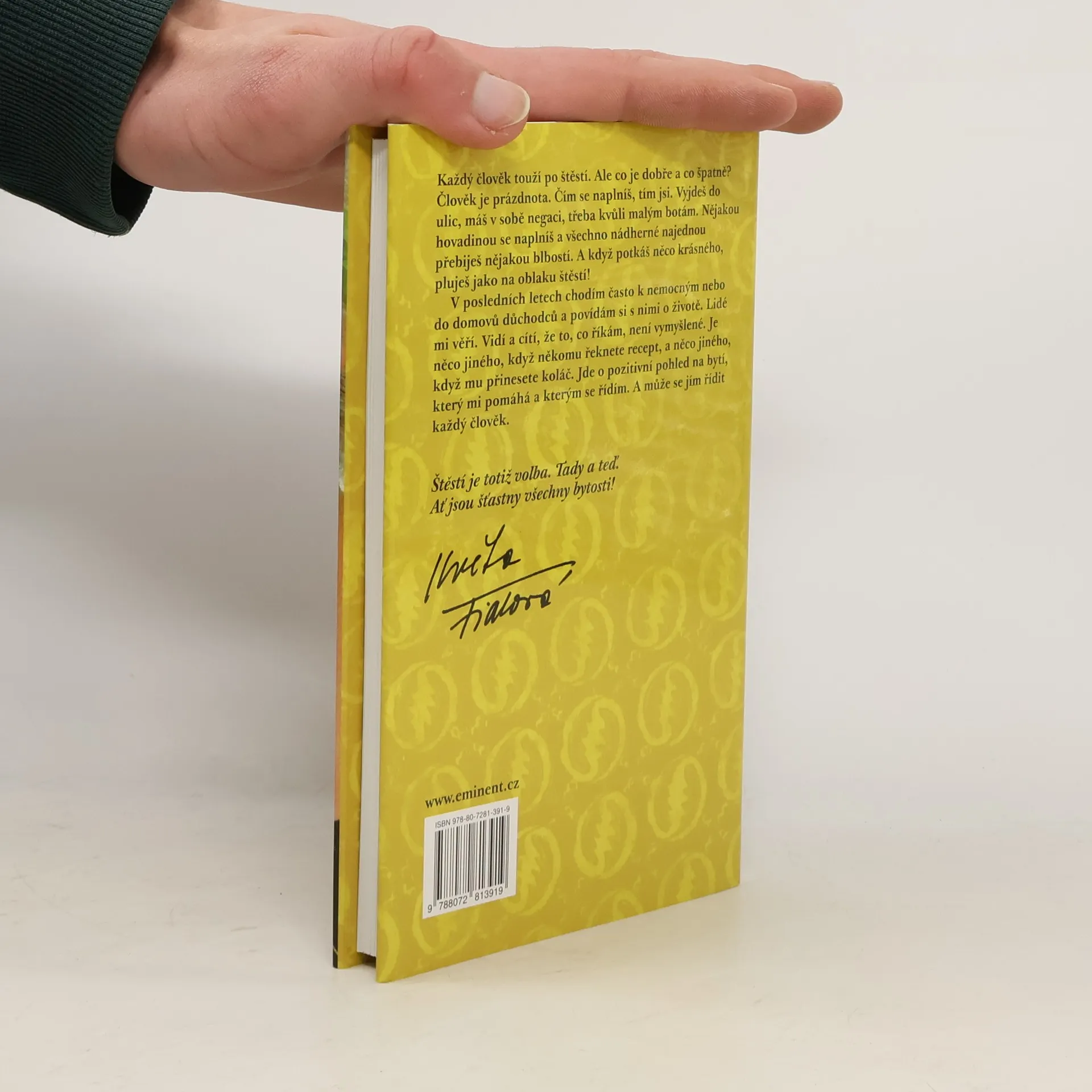 Každý člověk touží po štěstí. Ale co je dobré a co špatné? Člověk je prázdnota. Čím se naplníš, tím jsi. Vyjdeš do ulic, máš v sobě negaci, třeba kvůli malým botám. Nějakou hovadinou se naplníš a všechno nádherné najednou přebiješ nějakou blbostí. A když potkáš něco krásného, pluješ jako na oblaku štěstí! V posledních letech chodím často k nemocným nebo do domovů důchodců a povídám si s nimi o životě. Lidé mi věří. Vidí a cítí, že to, co říkám, není vymyšlené. Je něco jiného, když někomu řeknete recept, a něco jiného, když mu přinesete koláč. Jde o pozitivní pohled na bytí, který mi pomáhá a kterým se řídím. A může se jím řídit každý člověk. Štěstí je totiž volba. Tady a teď. Ať jsou šťastny všechny bytosti! To přeje vám i sobě Květa Fialová. Kniha je doplněna horoskopem od Pavla Turnovského.
