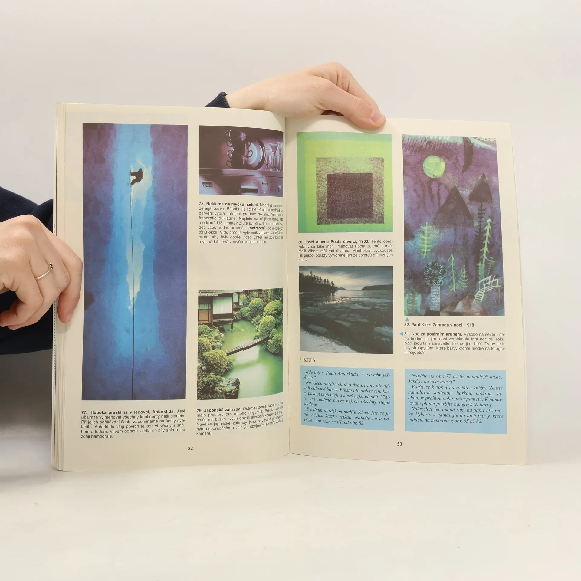 Výtvarná čítanka pro 2.–5. ročník základní školy. Čítanky tematicky zahrnují širokou oblast výtvarně estetických podnětů přírodního prostředí, výtvarné kultury a výtvarného umění včetně světa člověkem vytvářených a vyráběných předmětů a architektury. V prvním svazku se něco dozvíte o rukách a hlavě, o zvířatech a hlavně o barvách a představivosti.