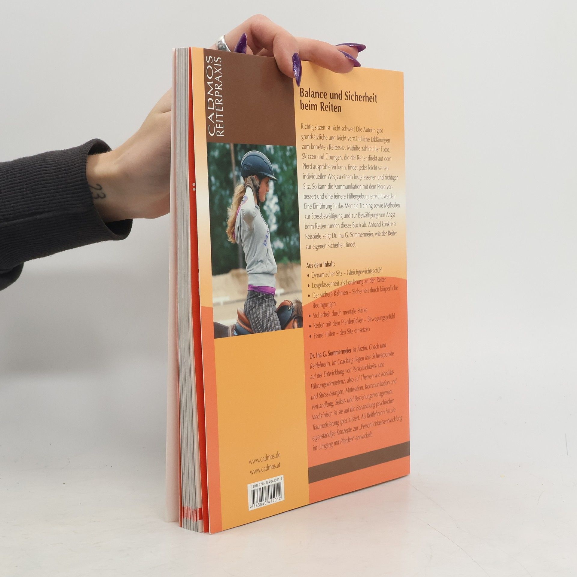 Wie lerne ich richtig sitzen? Mithilfe zahlreicher Übungen, die der Reiter direkt auf dem Pferd ausprobieren kann, kann man den richtigen Sitz leicht erlernen. Die Autorin gibt grundsätzliche und leicht verständliche Erklärungen und hilft dem Reiter, seinen individuellen Weg zu einem losgelassenen und korrekten Sitz zu finden. So kann die Kommunikation mit dem Pferd verbessert und eine feinere Hilfengebung erreicht werden. Erstmals wird auch das Thema Angst vor Pferden oder beim Reiten mit einbezogen. Anhand konkreter Beispiele zeigt Dr. Ina G. Sommermeier, wie der Reiter zur eigenen Sicherheit findet.