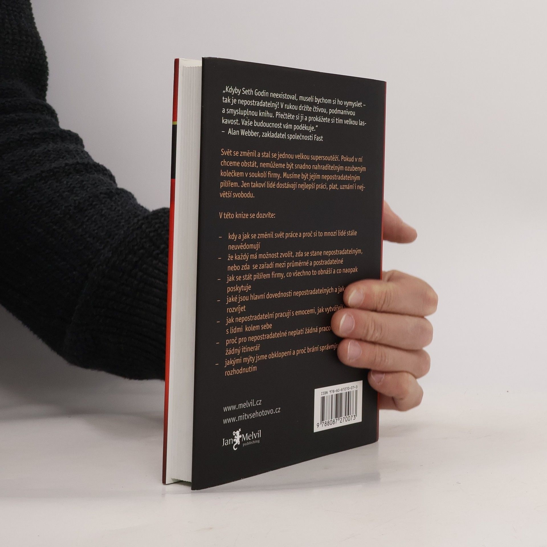 Nepostradatelní jsou základními stavebními kameny prosperující firmy. Tak jako může na pár skrytých pilířích stát dům nebo most, stejně tak ani oni nemusejí být vidět, ale jsou tu a jsou skutečně nepostradatelní. A v dnešním světě dostávají právě ta nejlepší pracovní místa a s nimi i nejvíc svobody. V této knize se dozvíte: - kdy a jak se změnil svět práce a proč si to mnozí lidé stále neuvědomují že každý má možnost zvolit, zda se stane nepostradatelným, nebo zda se zařadí mezi průměrné a postradatelné - jak se stát pilířem firmy, co všechno to obnáší a co naopak poskytuje - jaké jsou hlavní dovednosti nepostradatelných a jak se dají rozvíjet - jak nepostradatelní pracují s emocemi, jak vytvářejí vztahy s lidmi kolem sebe - proč pro nepostradatelné neplatí žádná pracovní příručka, žádný itinerář - jakými mýty jsme obklopeni a proč brání správným rozhodnutím