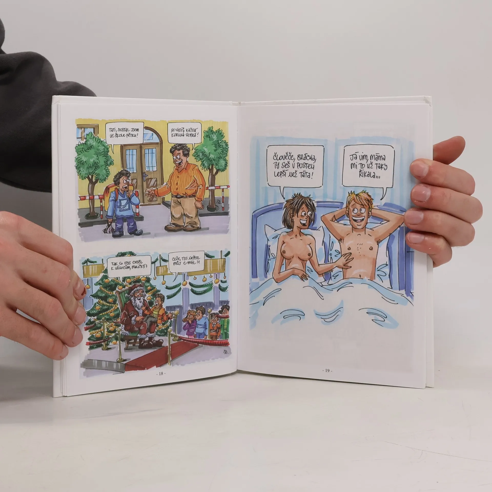 Kreslíř Kamil Tatar se v této knížce chopil nelehkého úkolu; inspiroval se známými i méně známými anekdotami z lidové slovesnosti a vdechl jim nový život v obrazové podobě. Vytvořil tak unikátní knihu, která zaručeně rozechvěje bránici každého čtenáře. Kresby, přestože jsou ve své podstatě velmi realistické, osloví živostí a hravostí, s níž výtvarník ke své práci přistupoval. Knížka pobaví nejen ty, kteří tyto anekdoty dosud neznají, ale i ty, jenž se s nimi již setkali v mluvené podobě, neboť vyznění humorné pointy je osobitým ztvárněním ilustrátora o to zábavnější.