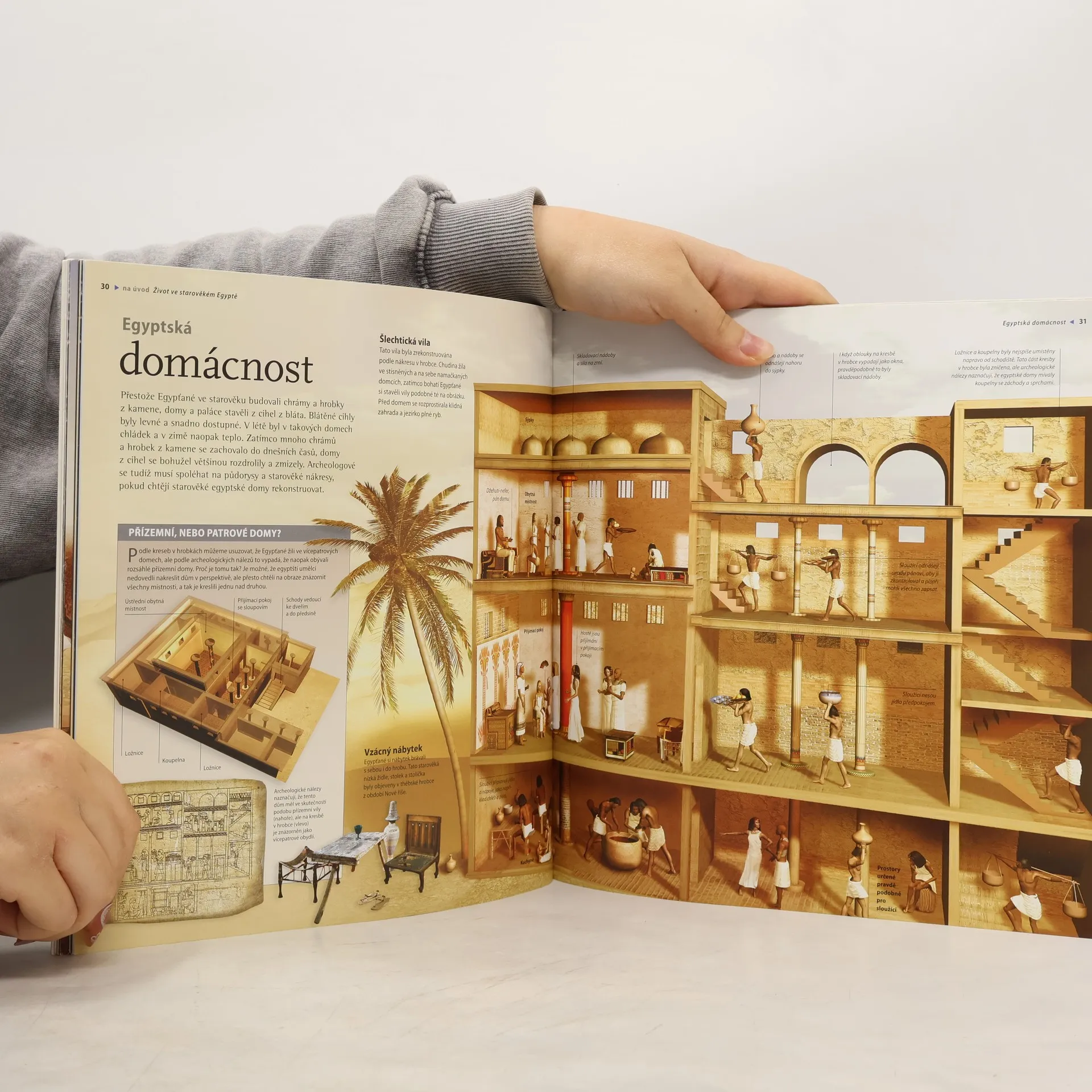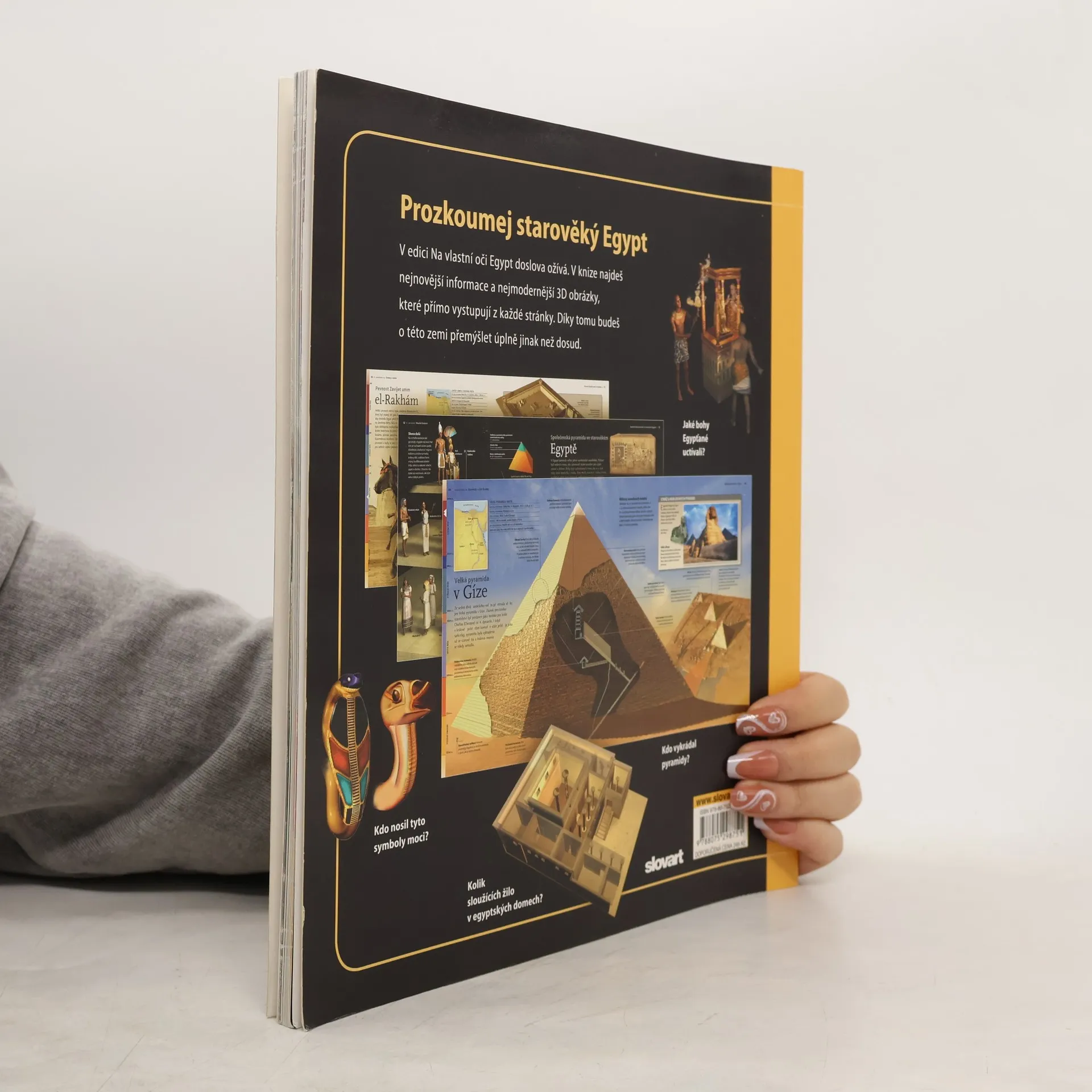 Po úvodních informacích o základních historických faktech, chronologii, vykopávkách a rozluštění hieroglyfů přechází čtenář z jedné zajímavé kapitoly do druhé: panteon staroegyptských bohů a bohyň, stavby pyramid, mumifikování zemřelých, představy Egypťanů o posmrtném životě, obdělávání půdy, které souviselo se záplavami Nilu, obraz egyptské domácnosti, umění a řemesla, staroegyptská armáda, Údolí králů, dobrodružství Howarda Cartera při objevení Tutanchamonovy hrobky, chrámy v Abú Simbelu, chrámový komplex v Karnaku a mnoho dalšího.