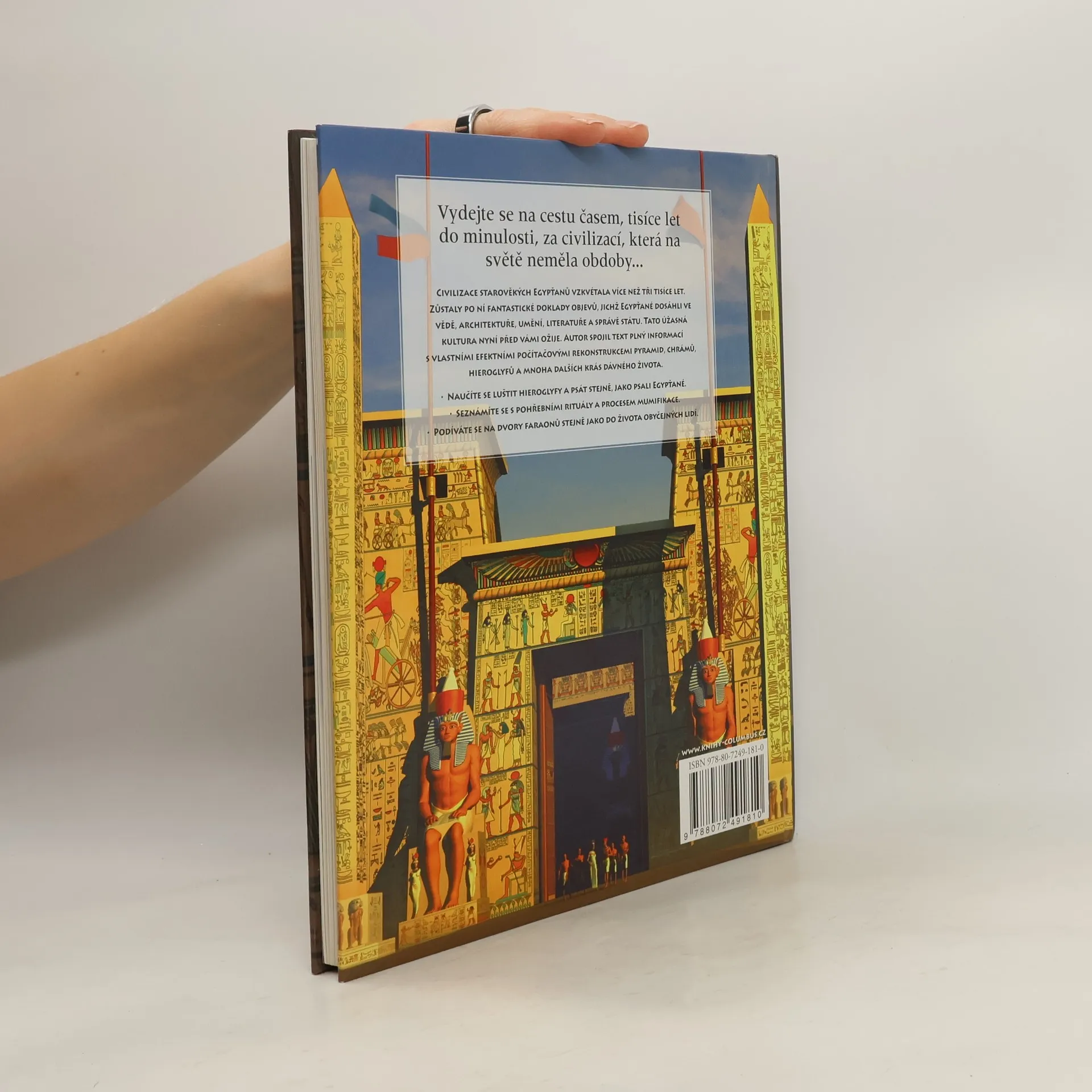 Živoucí obrazy z dob faraonů. Vydejte se na cestu časem, tisíce let do minulosti, za civilizací, která na světě neměla obdoby… Civilizace starověkých Egypťanů vzkvétala více než tři tisíce let. Zůstaly po ní fantastické doklady objevů, jichž Egypťané dosáhli ve vědě, architektuře, umění, literatuře a správě státu. Tato úžasná kultura nyní před vámi ožije. Autor spojil text plný informací s vlastními efektními počítačovými rekonstrukcemi pyramid, chrámů, hieroglyfů a mnoha dalších krás dávného života. * Naučíte se luštit hieroglyfy a psát stejně, jako psali Egypťané. * Seznámíte se s pohřebními rituály a procesem mumifikace. * Podíváte se na dvory faraonů stejně jako do života obyčejných lidí.