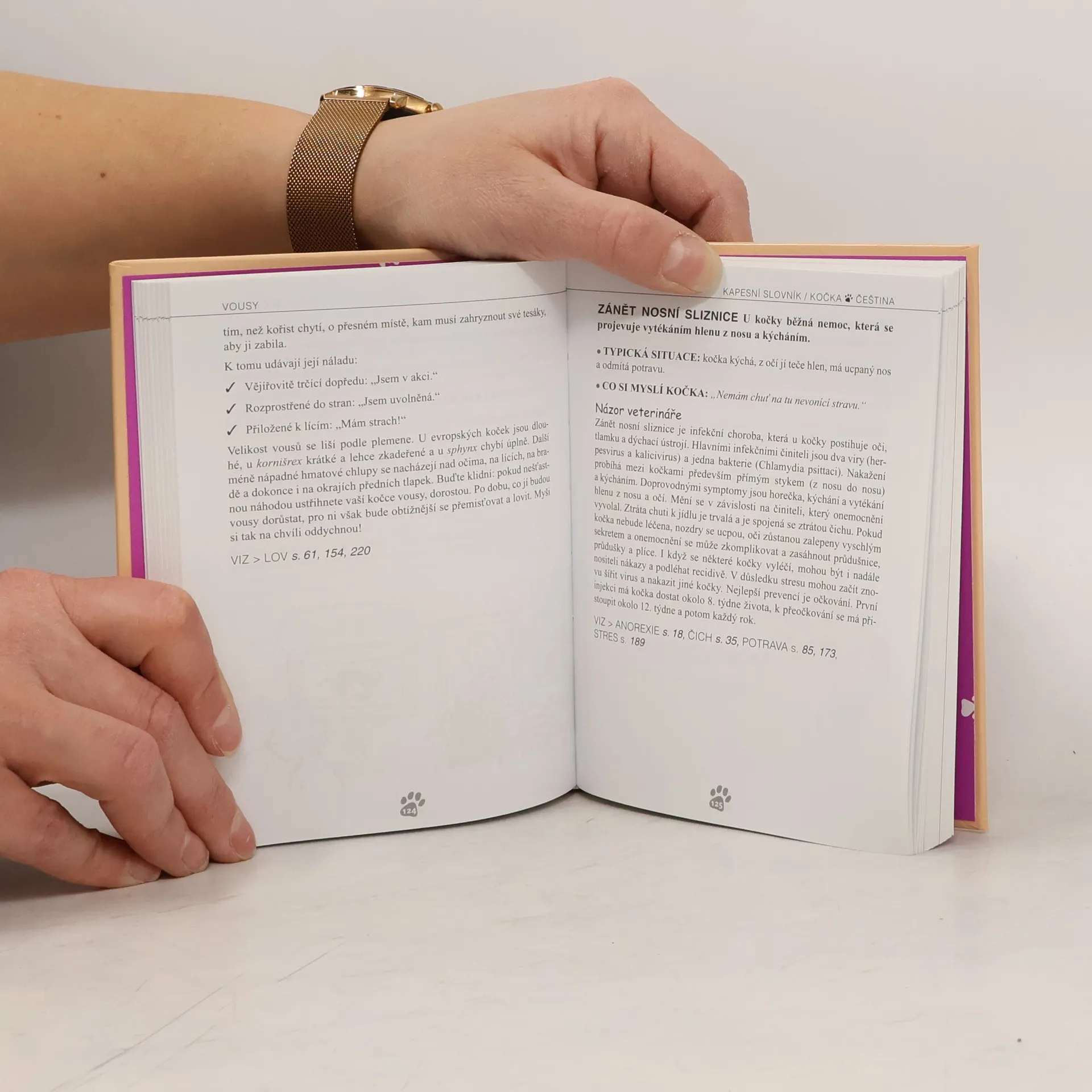 První oboustranný slovník, který hovoří jak kočičí řečí, tak i slovy jejich pánů. Nepostradatelný průvodce komunikací mezi člověkem a jeho kočkou (či kočkou a jejím člověkem) převádí chování a každodenní situace těchto dvou živočišných druhů do "lidské" a "kočičí" řeči pomocí 160 klíčových slov seřazených od A do Z. Něžný, ale i konfliktní vztah mezi člověkem a kočkou doprovází více než 100 humorných kreseb.