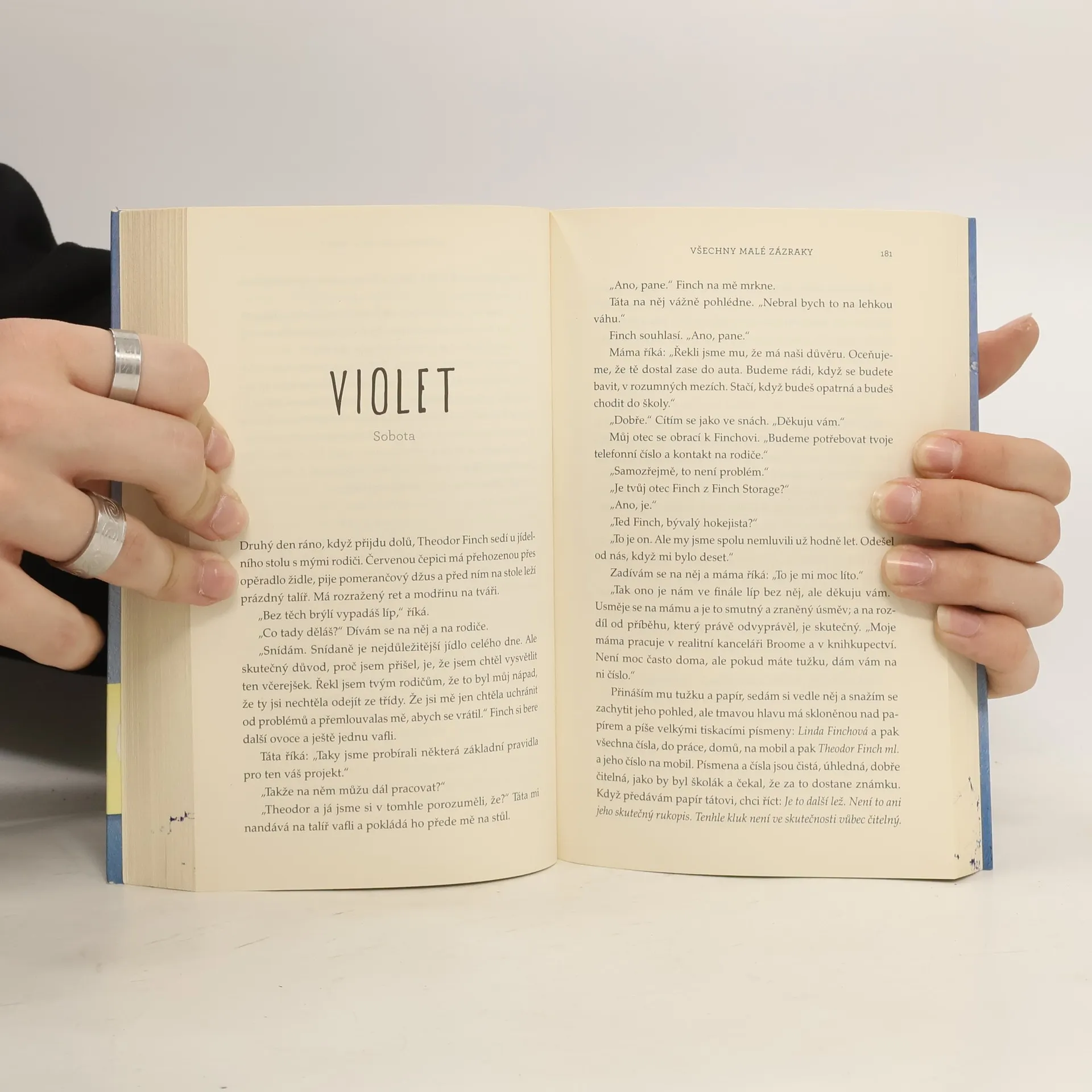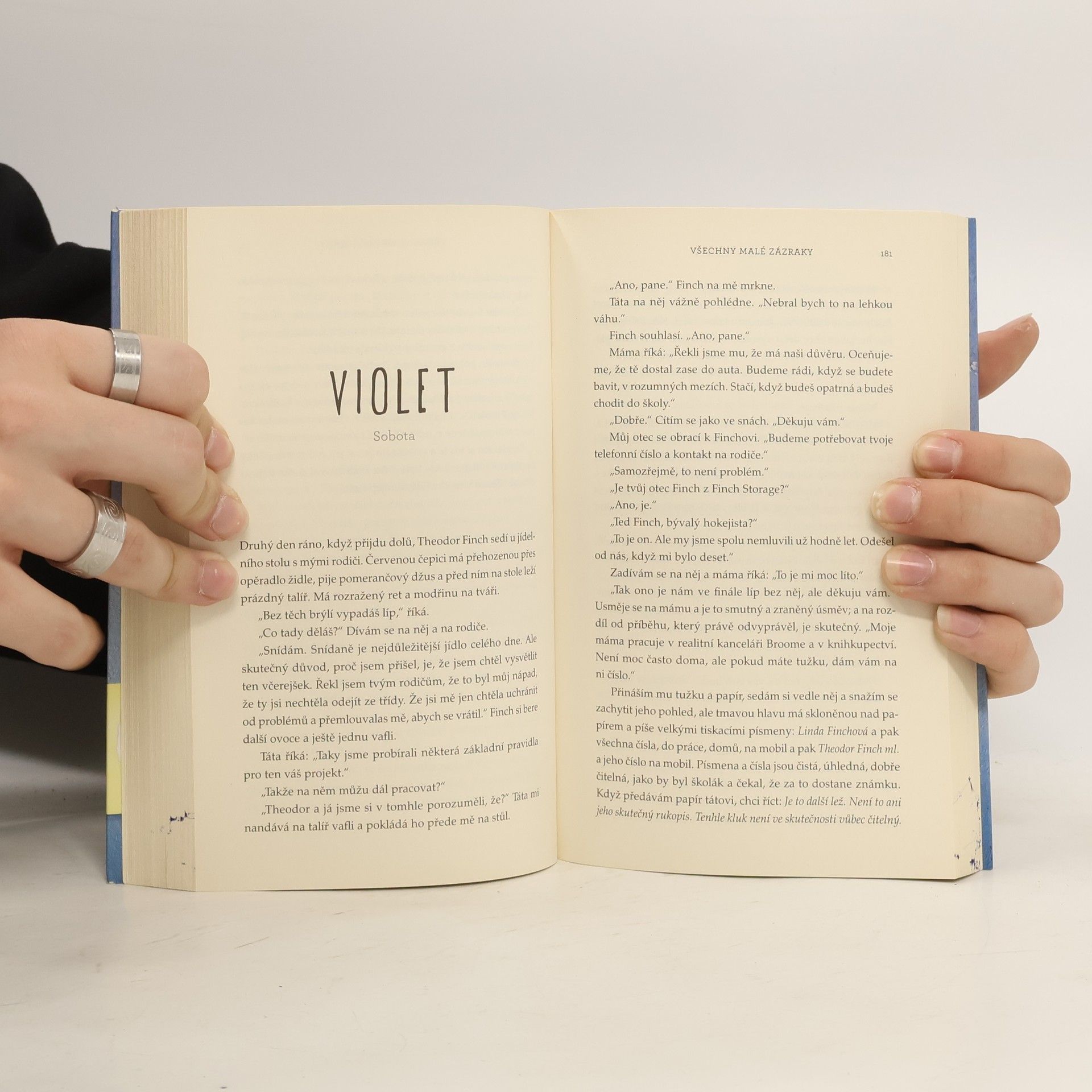 Strhující příběh o hledání a (ne)nalézání, o lidských předsudcích a první lásce. Theodora Finche fascinuje smrt. Violet Markeyová zase žije pro budoucnost – těší se na den, kdy dokončí střední školu a bude moct opustit rodné městečko, které jí připomíná nedávnou tragickou smrt sestry. Když se ti dva potkají na římse školní zvonice, není ale docela jasné, kdo koho vlastně bude zachraňovat. Finch je obyčejný kluk, až na to, že trpí bipolární poruchou. Violet je obyčejná holka, až na to, že Finchovi přijde úplně neobyčejná. Ty dva svede dohromady školní projekt, jehož cílem je objevovat „krásy Indiany“, a oba při tom učiní zajímavé objevy...