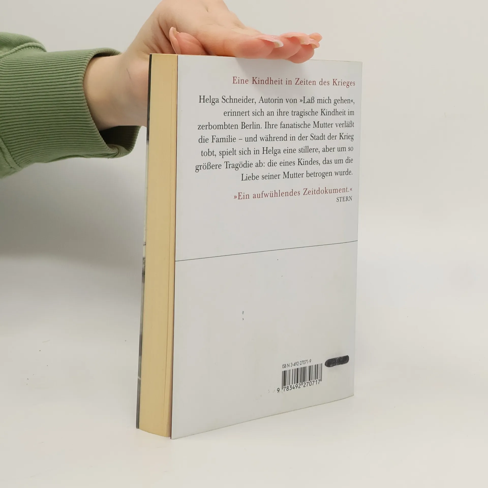 Eine Kindheit in Zeiten des KriegesHelga Schneider, Autorin von "Laß mich gehen", erinnert sich an ihre tragische Kindheit im zerbombten Berlin. Ihre fanatische Mutter verläßt die Familie - und während in der Stadt der Krieg tobt, spielt sich in Helga eine stillere, aber um so größere Tragödie die eines Kindes, das um die Liebe seiner Mutter betrogen wurde.